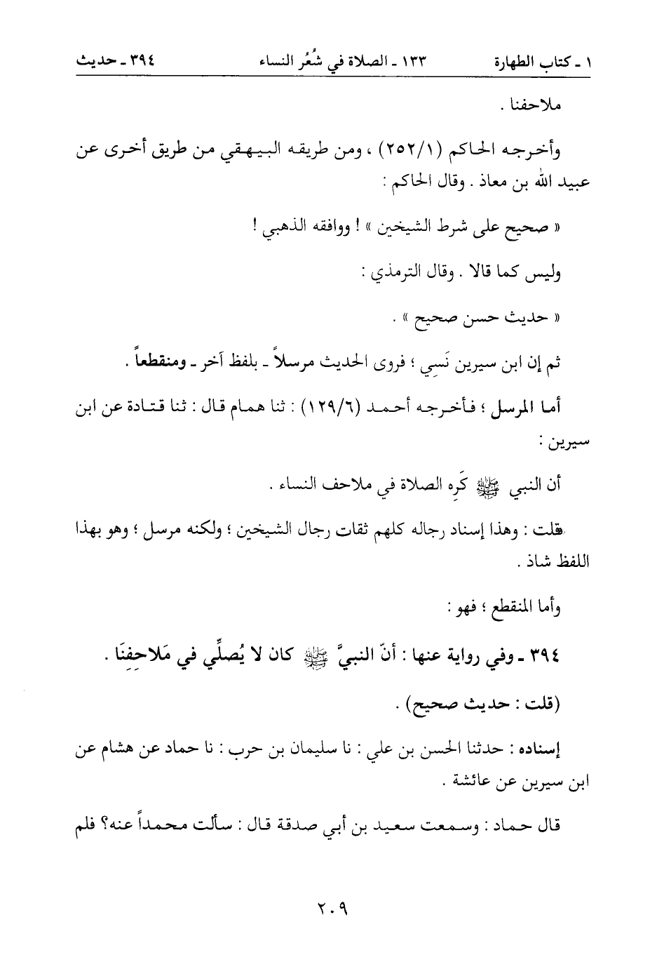 394- وفي رواية عنها: أنّ النبيَّ صَلَّى اللَّهُ عَلَيْهِ وَسَلَّمَ كان لا يصلِّي في مَلاحِفِنَا.
