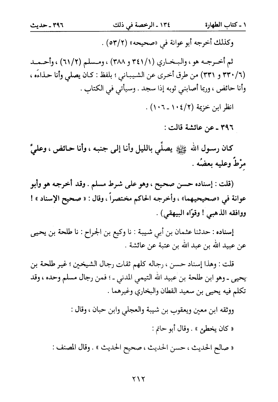 كان رسول الله صَلَّى اللَّهُ عَلَيْهِ وَسَلَّمٍَ يصلِّي بالليل وأنا إلى جنبه، وأنا حائض، وعلي