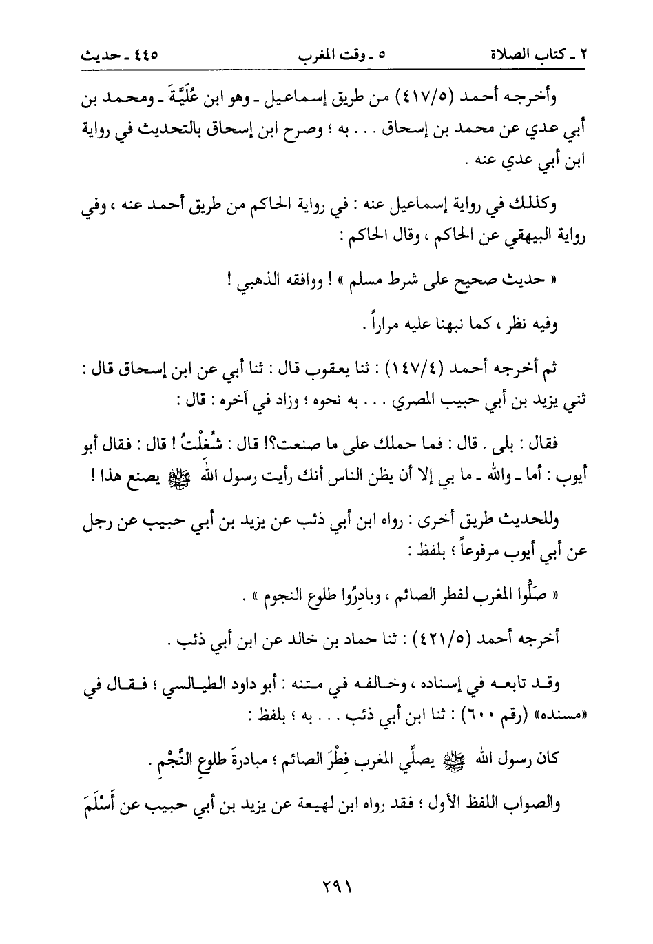 كان رسول الله صَلَّى اللَّهُ عَلَيْهِ وَسَلَّمَ يصلَي المغرب فِطرَ الصائم؛ مبادرةَ طلوعِ النجْمِ.