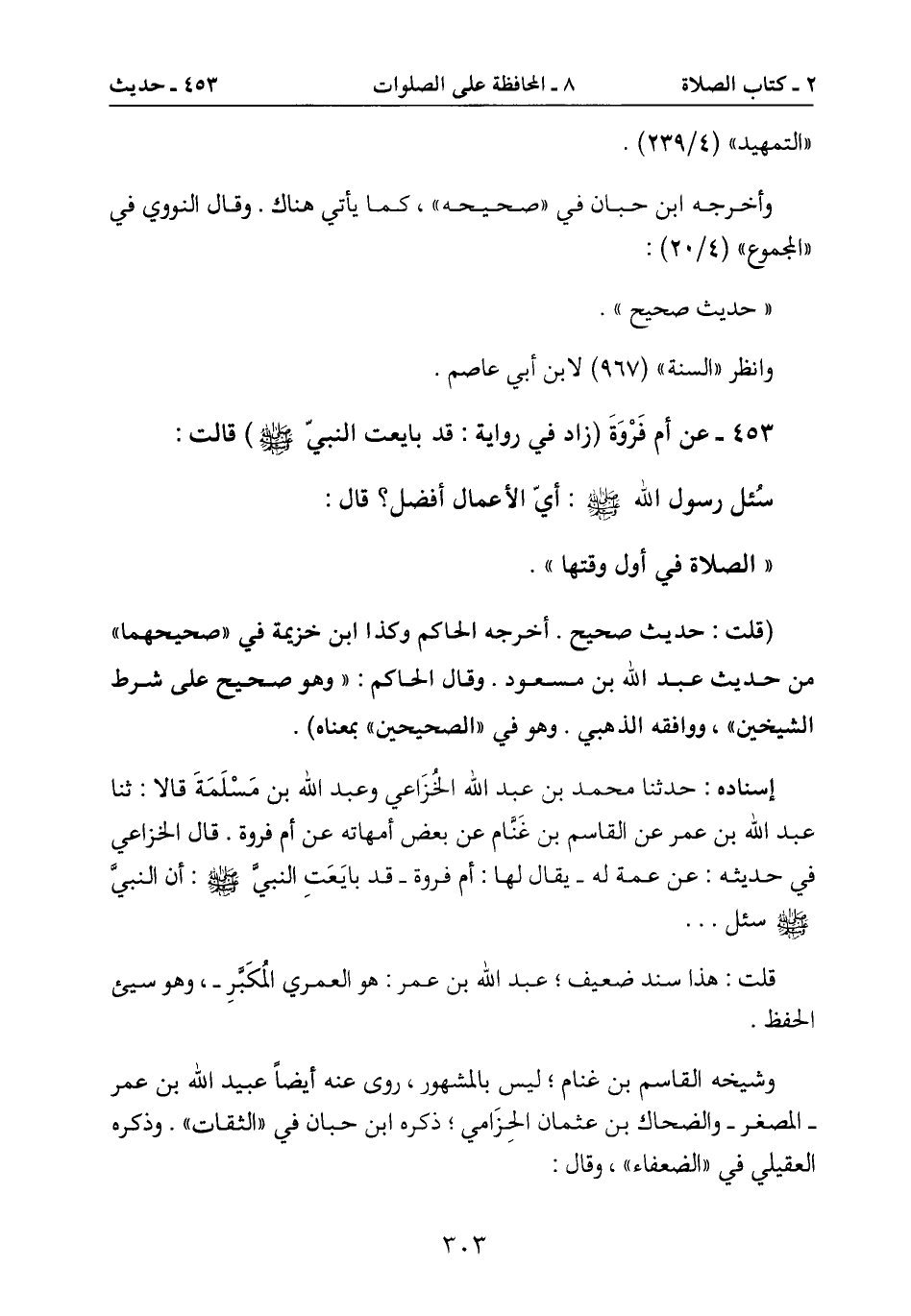 453- عن أم فَرْوَةَ (زاد في رواية: قد بايعت النبيّ صَلَّى اللَّهُ عَلَيْهِ وَسَلَّمَ) قالت: