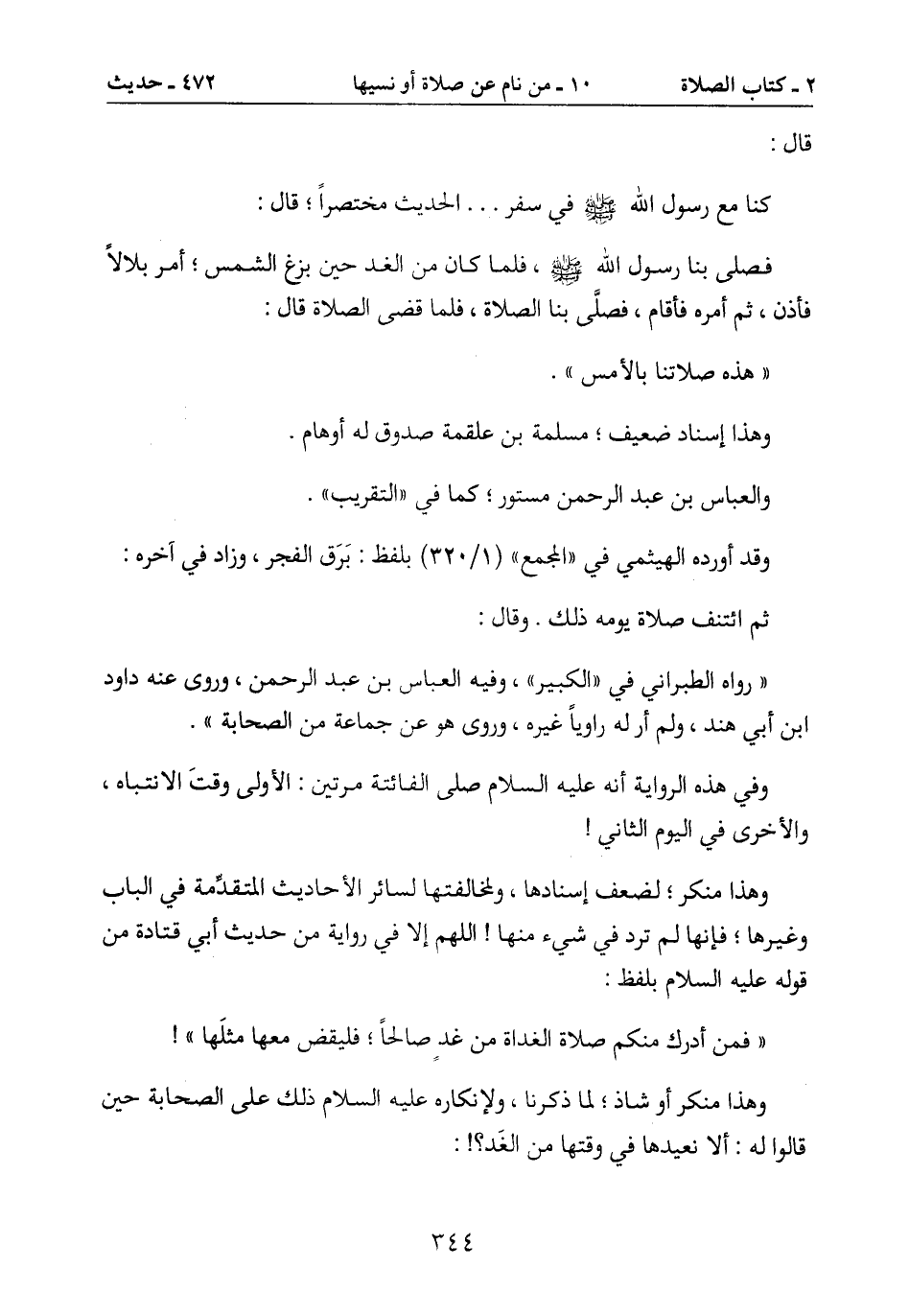 وفي هذه الرواية أنه عليه السلام صلى الفائتة مرتين: الأولى وقتَ الانتباه،