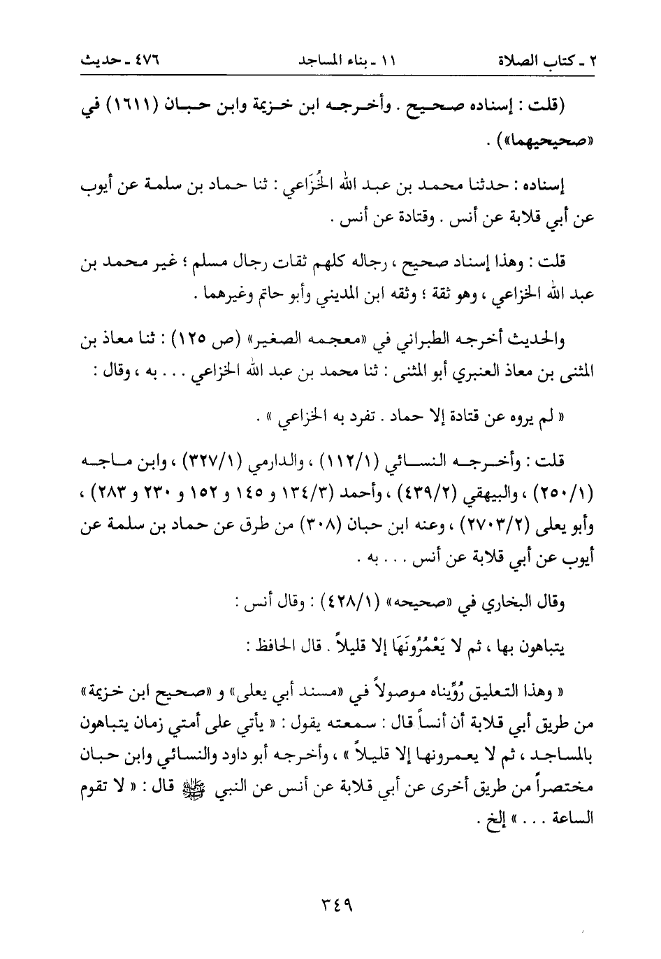 بالمساجد، ثم لا يعمرونها إلا قليلا "، وأخرجه أبو داود والنسائي وابن حبان