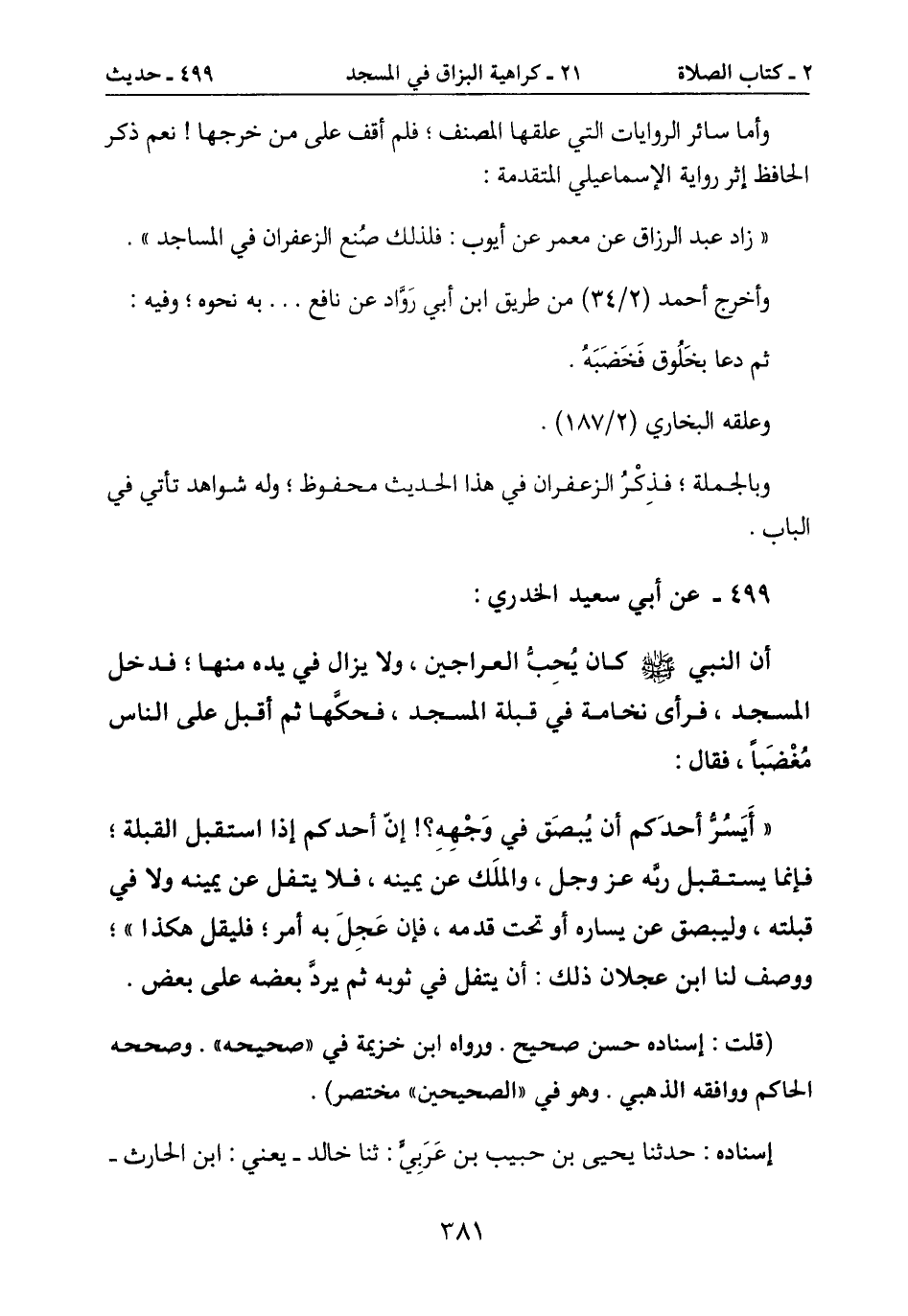 " آيَسُزُ أحدَكم أن يُبصَق في وَجْهِهِ؟! إنّ أحدكم إذا استقبل القبلة؛