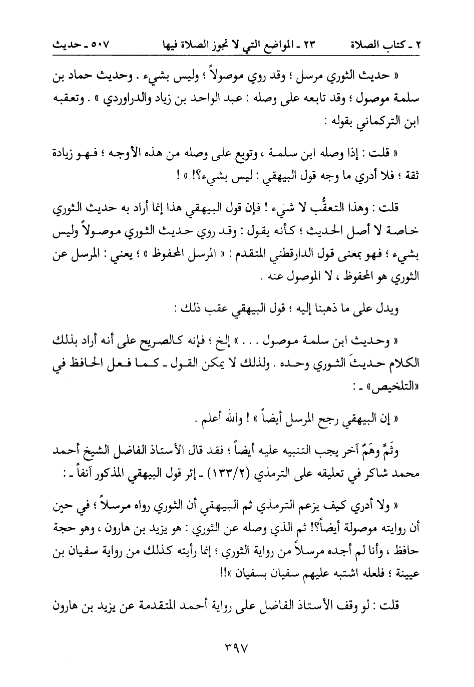 قلت: وهذا التعقُب لا شيء! فإن قول البيهقي هذا إنما أراد به حديث الثوري