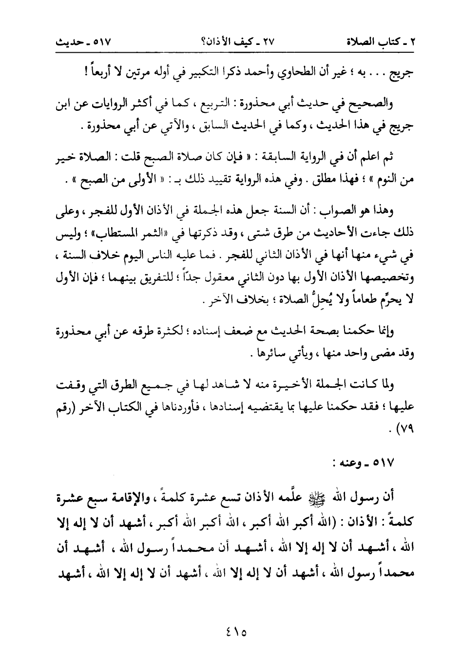 أن رسول الله صَلَّى اللَّهُ عَلَيْهِ وَسَلَّمَ علمه الأذان تسع عشره كلمةً، والاقامة سبع عشرة