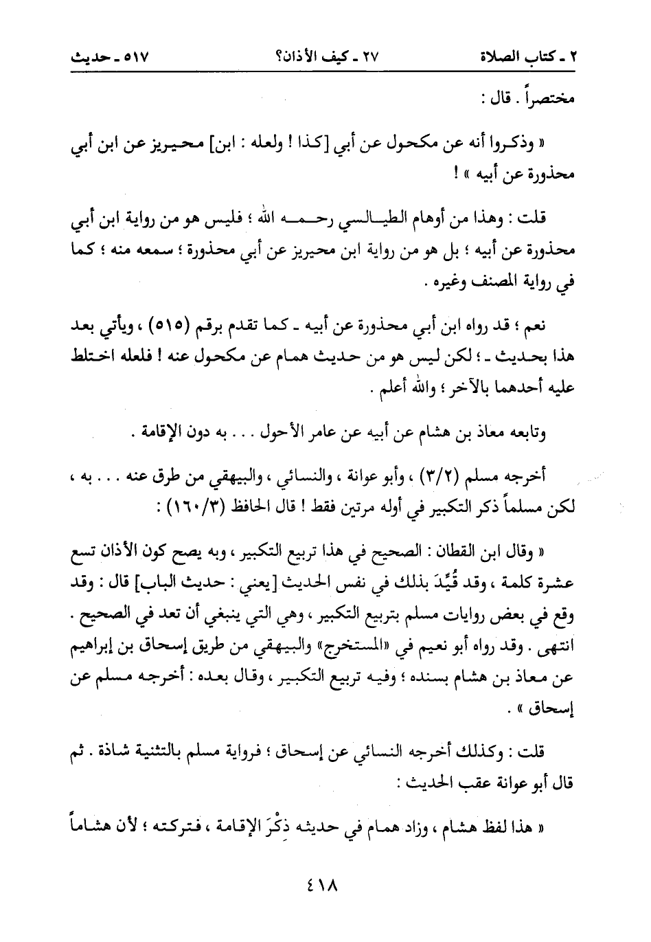 " وقال ابن القطان: الصحيح في هذا تربيع التكبير، وبه يصح كون الأذان تسع