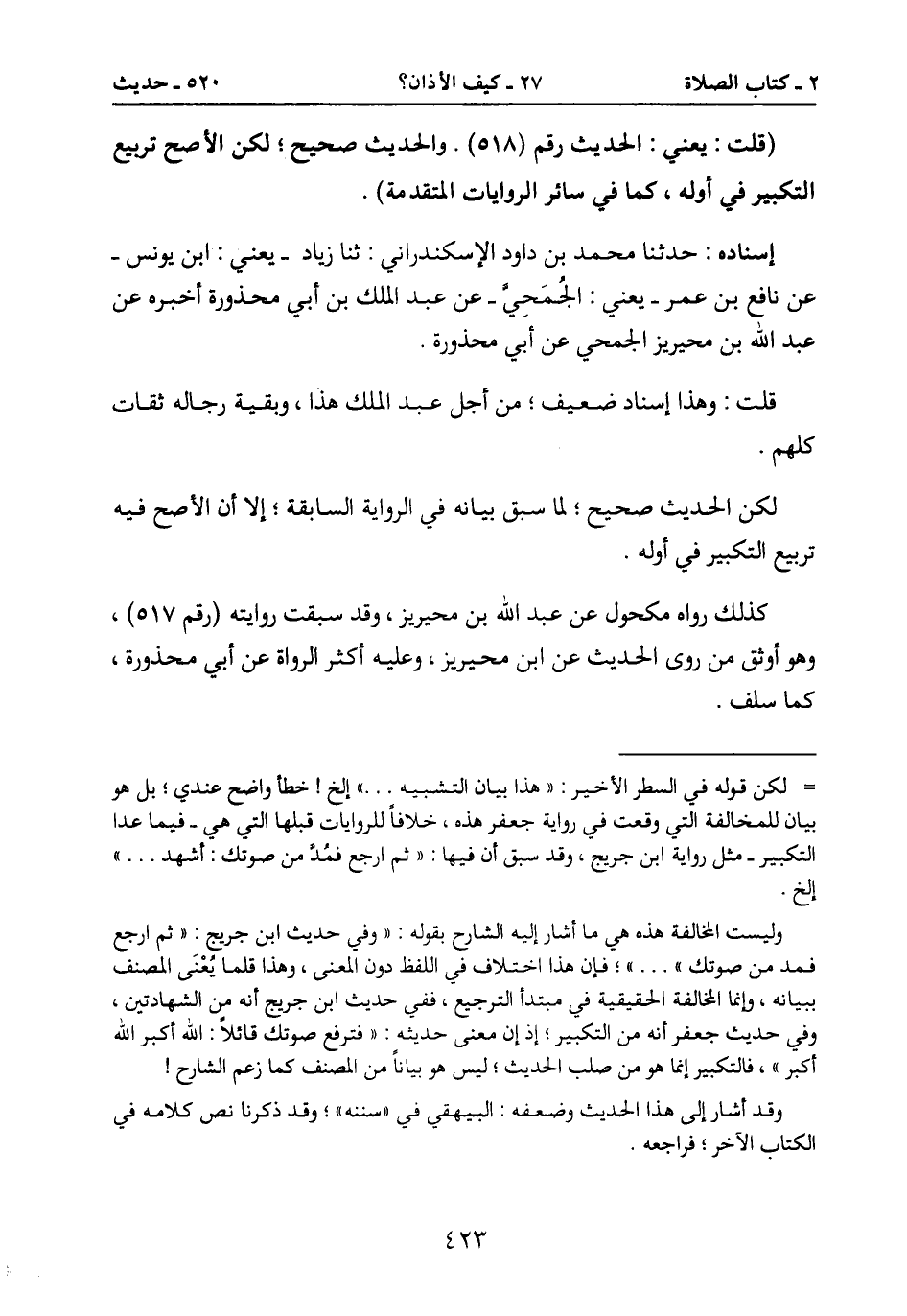 (قلت: يعني: الحديث رقم (518) . والحديث صحيح؛ لكن الأصح تربيع