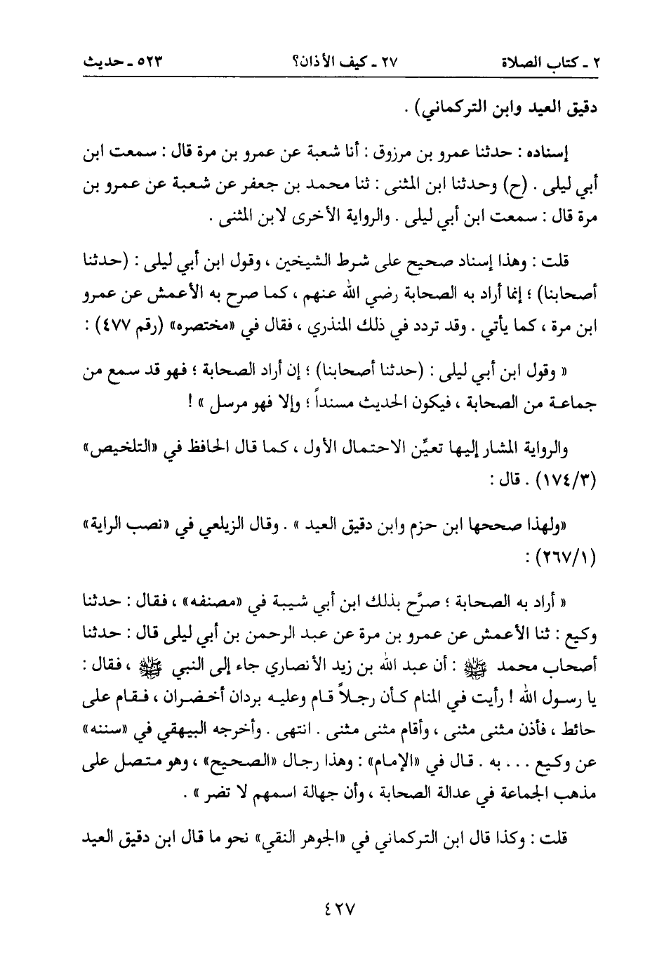 "ولهذا صححها ابن حزم وابن دقيق العيد ". وقال الزيلعي في "نصب الراية"