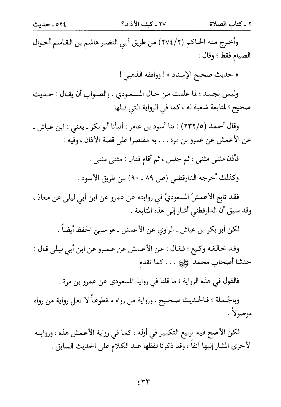 لكن الأصح فيه تربيع التكبير في أوله، كما في رواية الأعمش هذه، وروايته