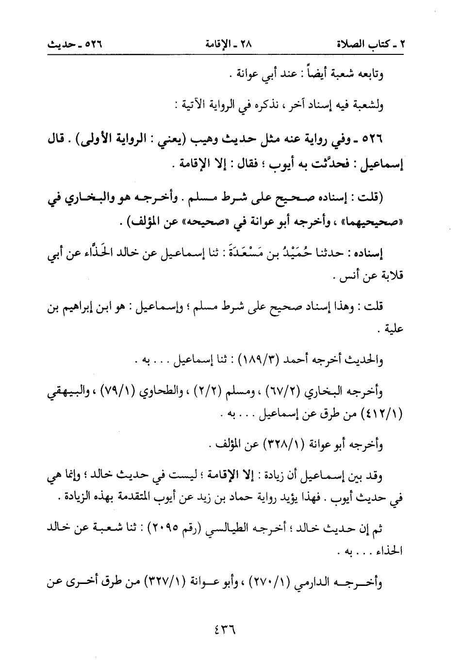 526- وفي رواية عنه مثل حديث وهيب (يعني: الرواية الأولى) . قال
