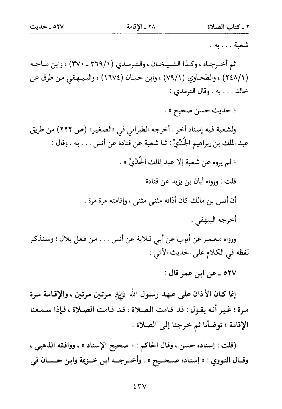 أن أنس بن مالك كان أذانه مثنى مثنى، وإقامته مرة مرة.