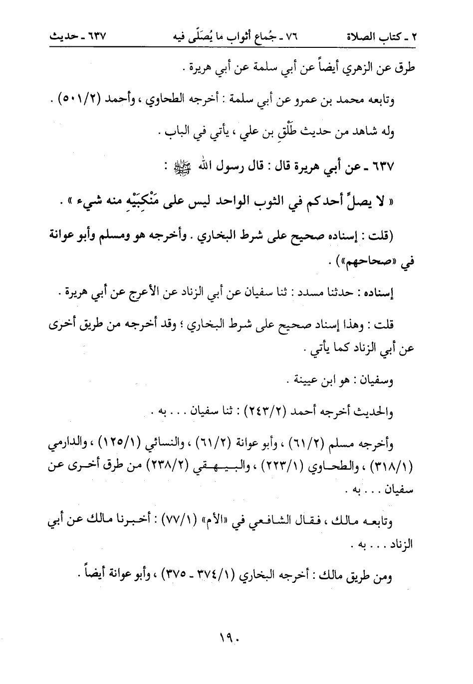 " لا يصل أحدكم في الثوب الواحد ليس على مَنْكِبَيْهِ منه شيء ".