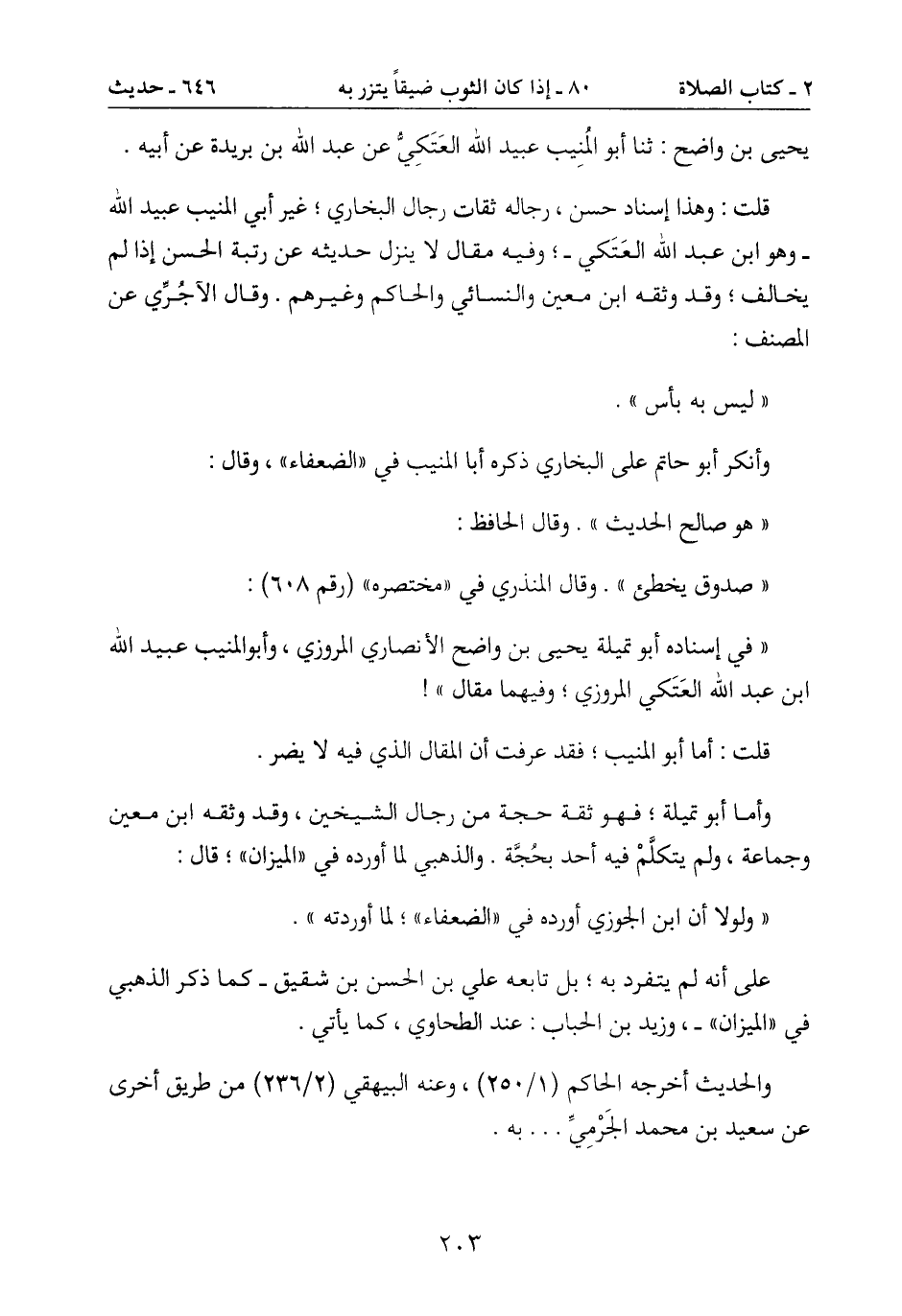 قلت: وهذا إسناد حسن، رجاله ثقات رجال البخاري؛ غير أبي المنيب عبيد الله
