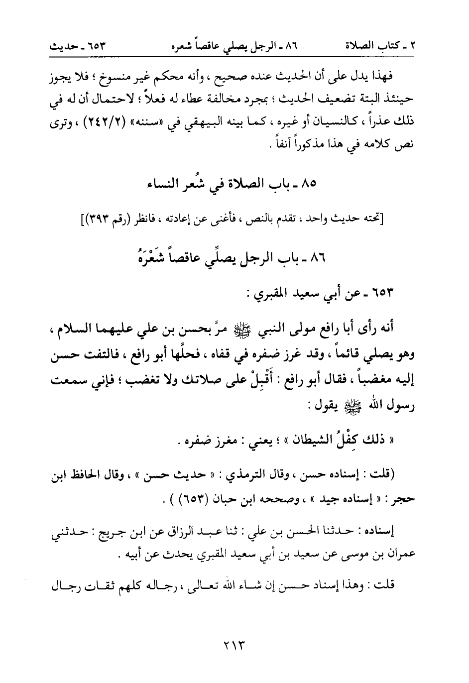 وهو يصلي قائماً، وقد غرز ضفره في قفاه، فحلَّها أبو رافع، فالتفت حسن