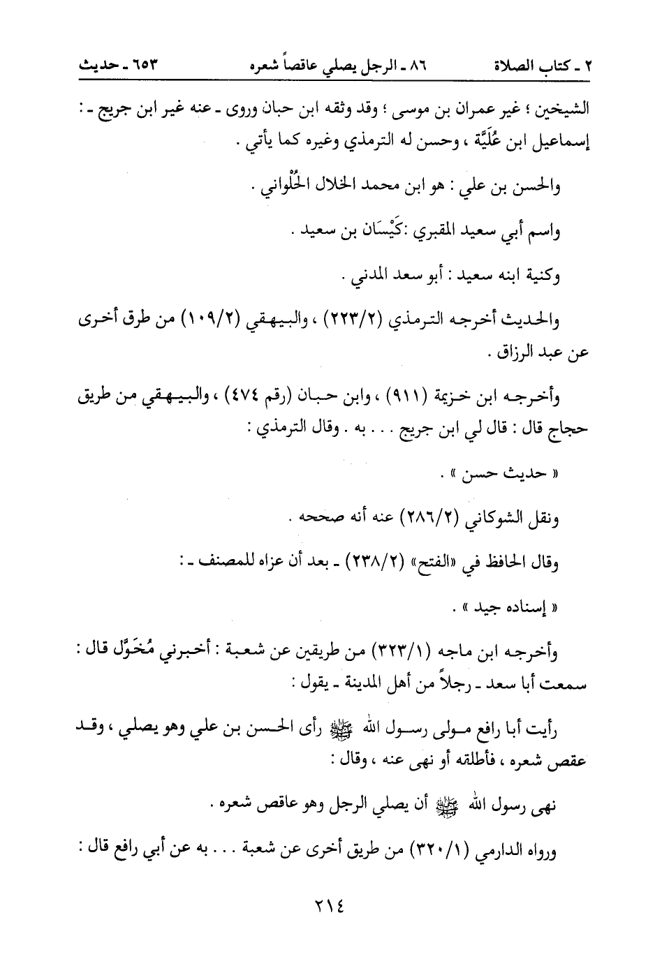 رأيت أبا رافع مولى رسول الله صَلَّى اللَّهُ عَلَيْهِ وَسَلَّمَ رأى الحسن بن علي وهو يصلي، وقد