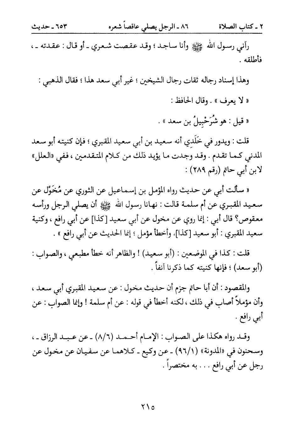 سعيد المقبري: أبو سعيد [كذا] ، وأخطأ مؤمل؛ إنما الحديث عن أبي رافع ".