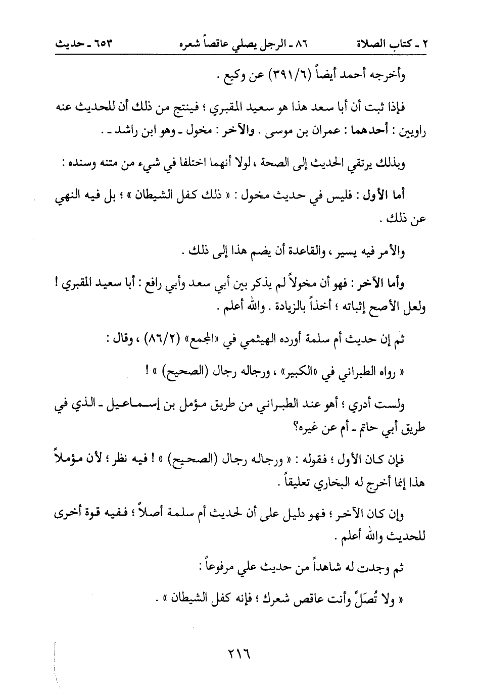 " ولا تصَلِّ وأنت عاقص شعرك؛ فإنه كفل الشيطان ".