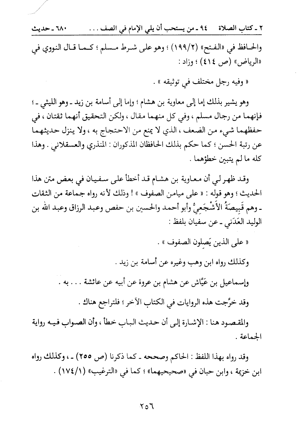 الحديث؛ وهو قوله: " على ميامن الصفوف "! وذلك لأنه رواه جماعة من الثقات