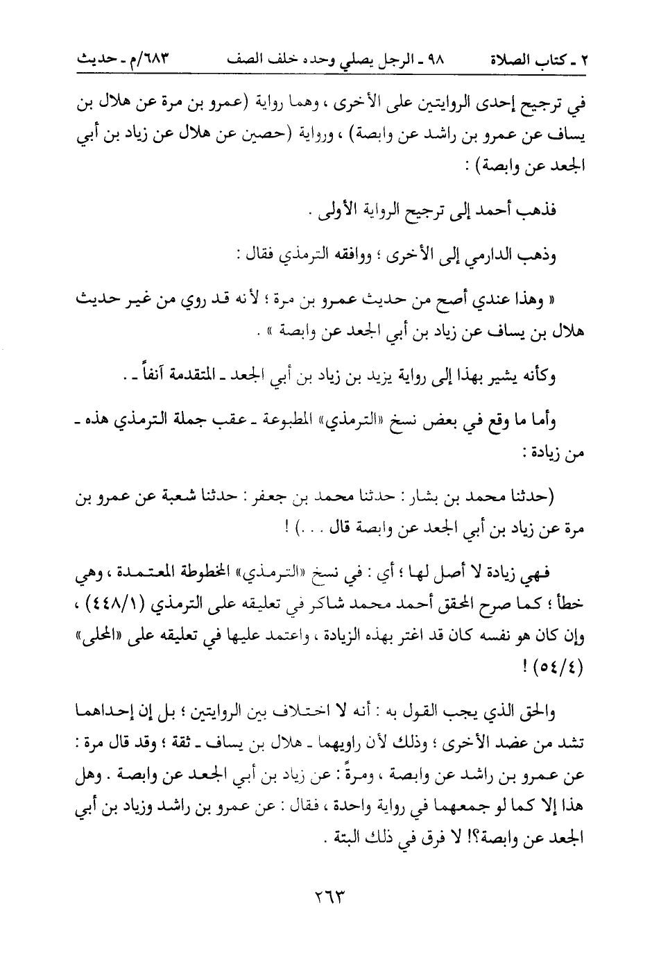 في ترجيح إحدى الروايتين على الأخرى، وهما رواية (عمرو بن مرة عن هلال بن