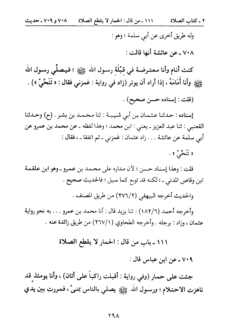 صَلَّى اللَّهُ عَلَيْهِ وَسَلَّمَ وأنا آمَامَهُ، إذا أراد أن يوتر (زاد في رواية: غمزني فقال: " تَنَخَيْ ") .