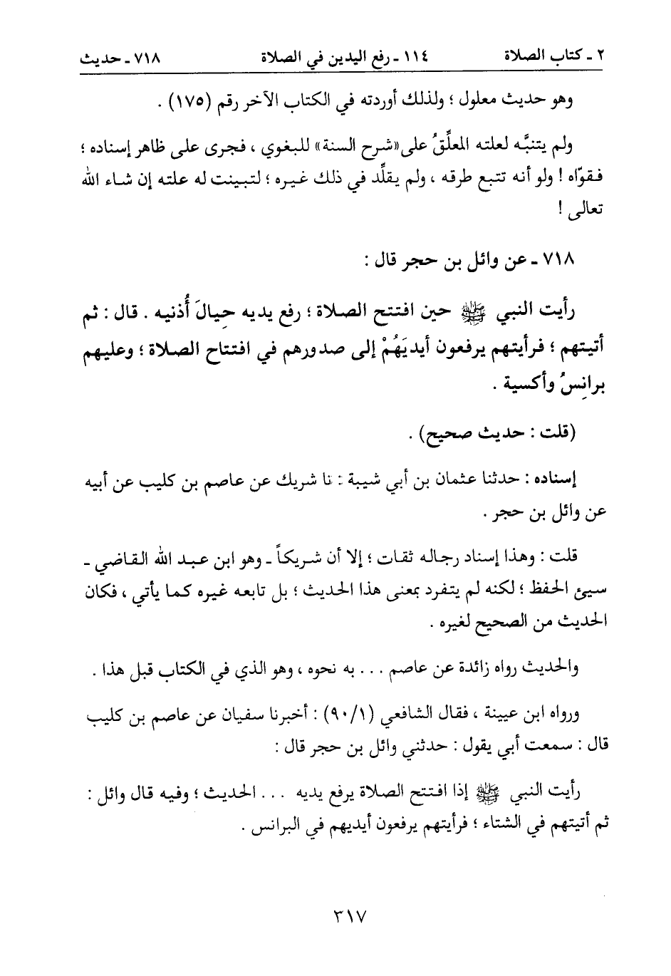 رأيت النبي صَلَّى اللَّهُ عَلَيْهِ وَسَلَّمَ إذا افتتح الصلاة يرفع يديه ... الحديث؛ وفيه قال وائل: