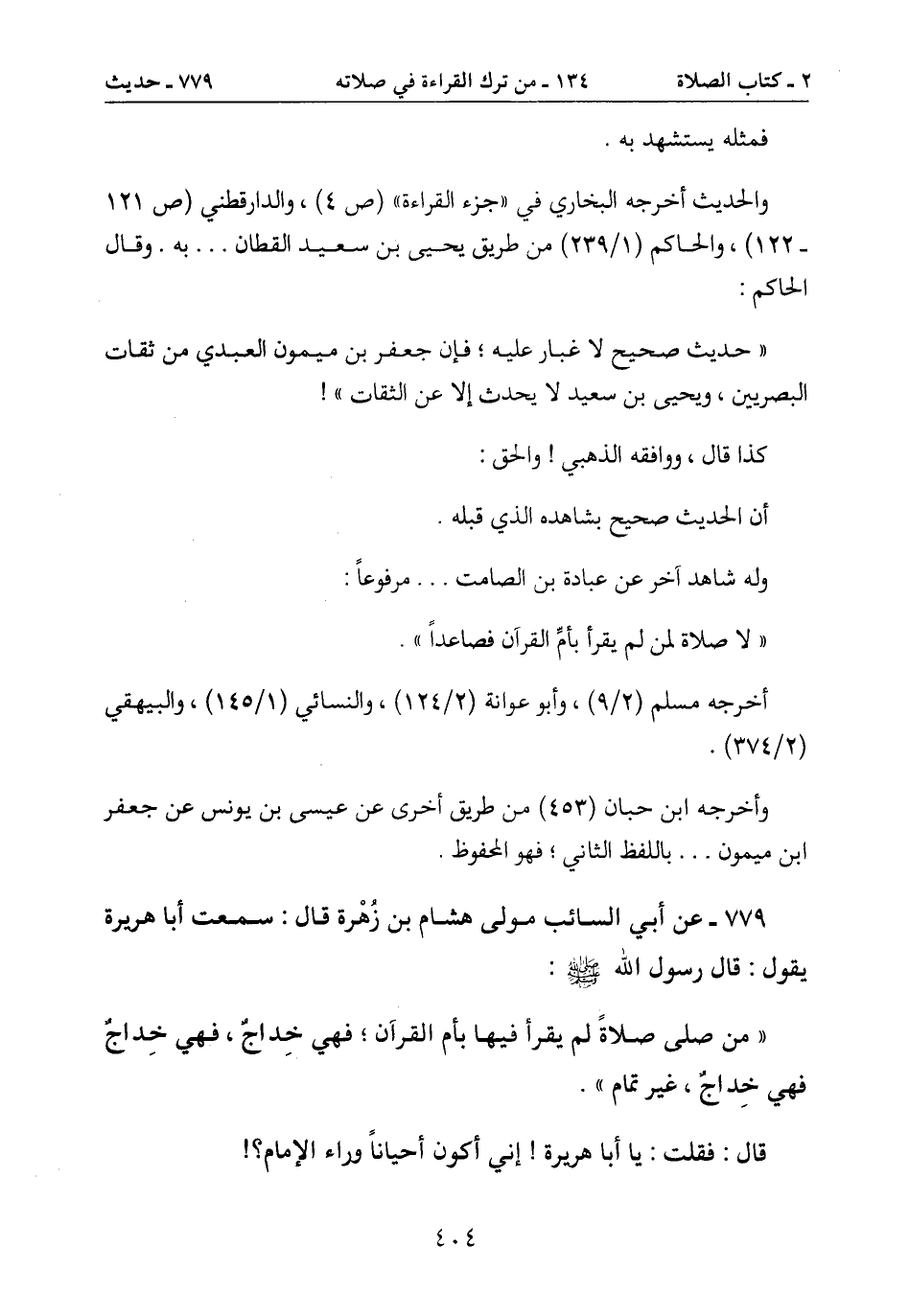 " لا صلاة لمن لم يقرأ باًمِّ القرآن فصاعداً ".