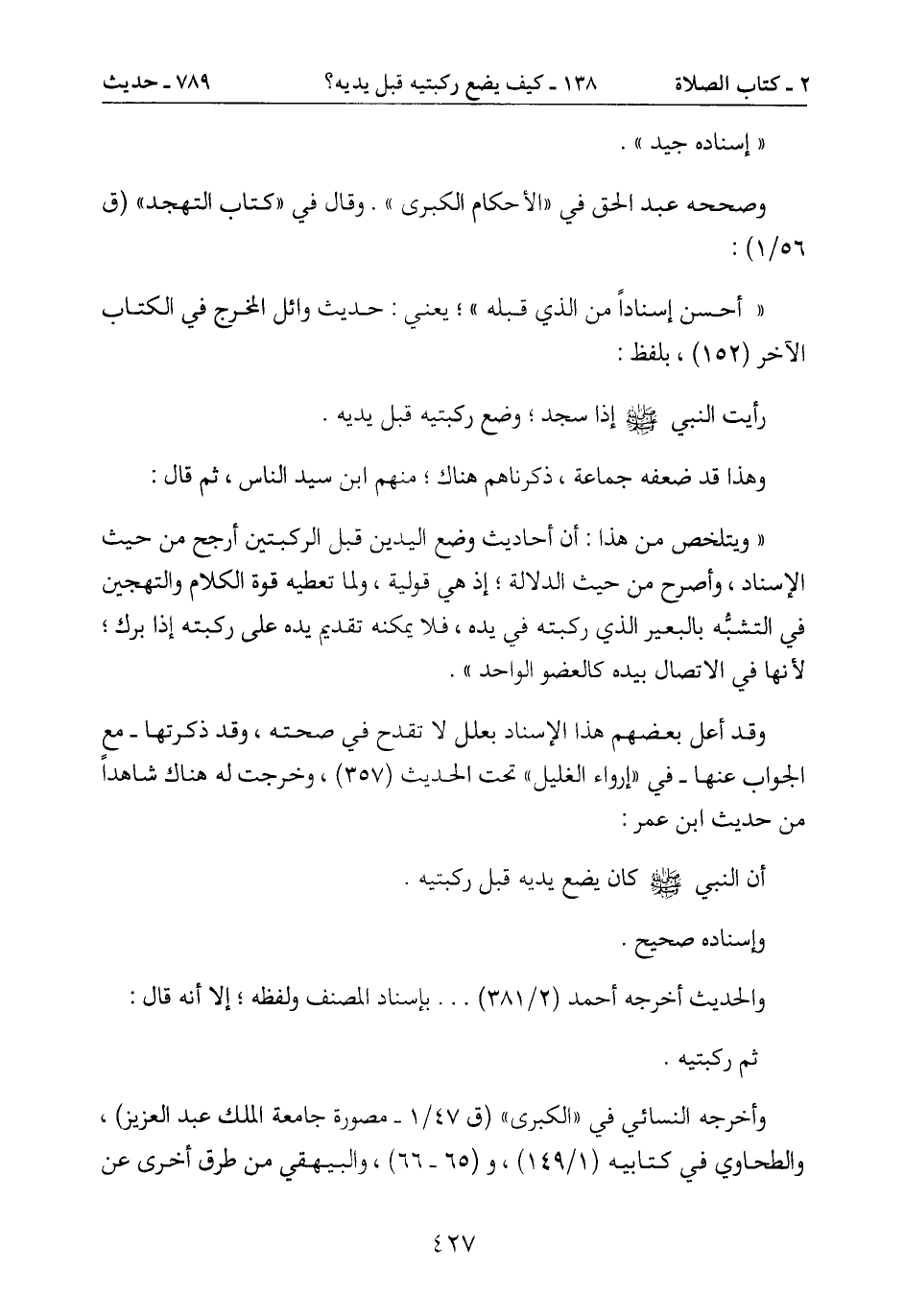 أن النبي صَلَّى اللَّهُ عَلَيْهِ وَسَلَّمَ كان يضع يديه قبل ركبتيه.