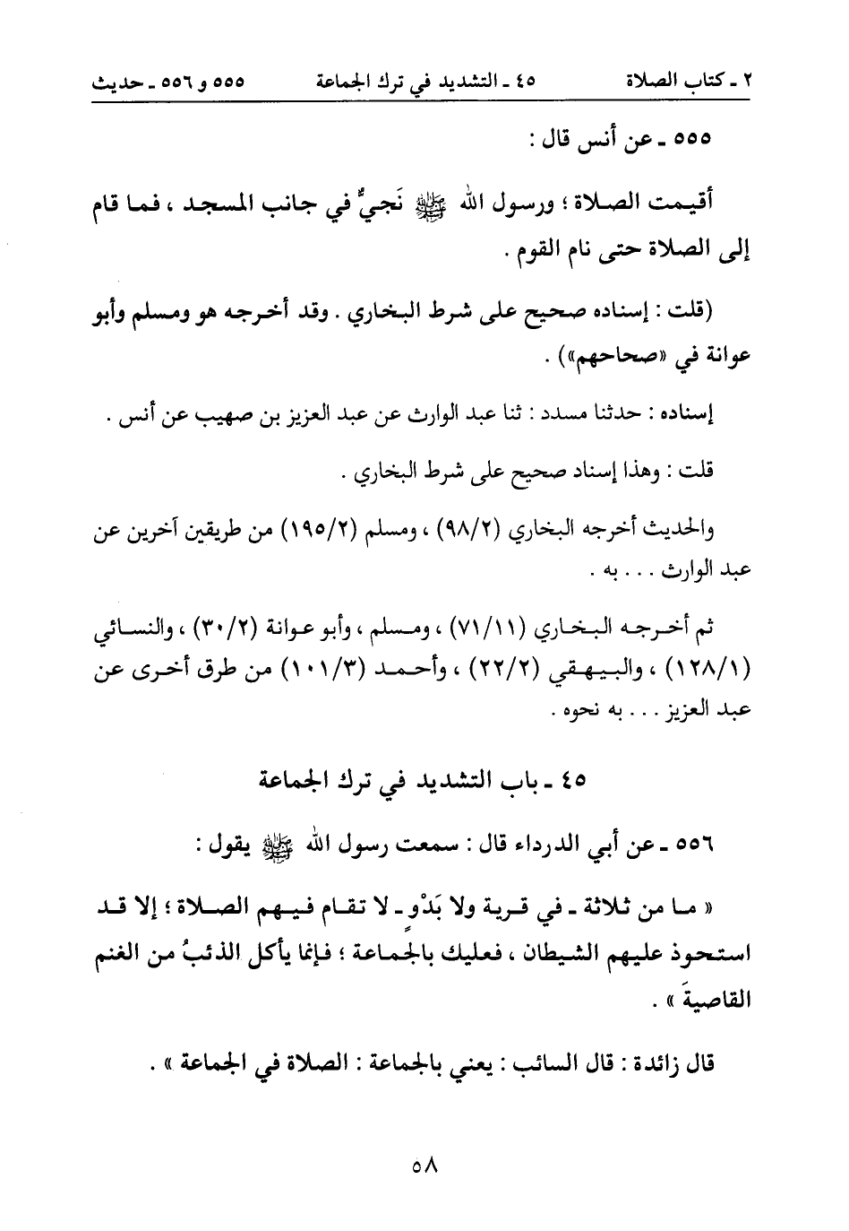 قال زائدة: قال السائب: يعني بالجماعة: الصلاة في الجماعة ".
