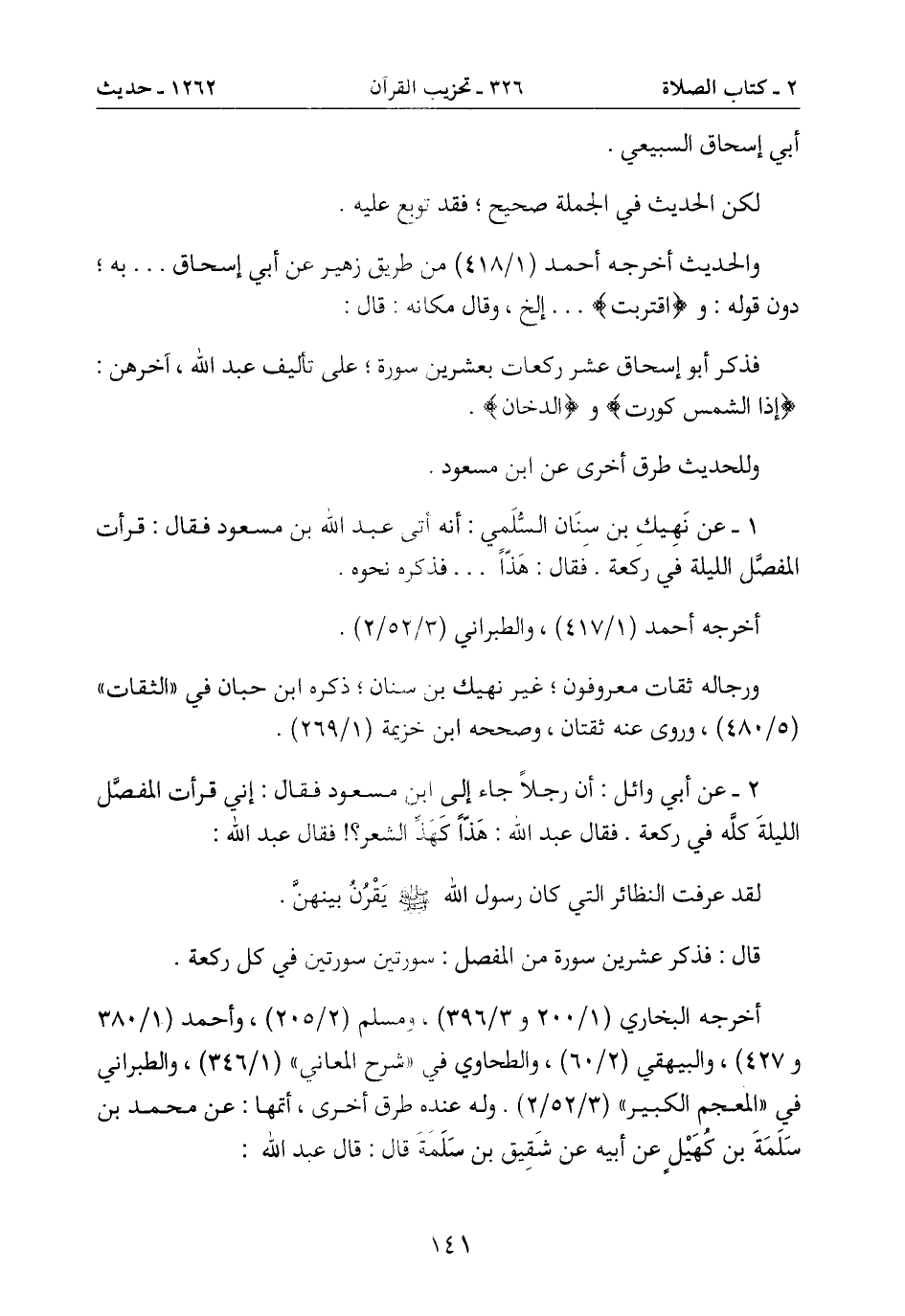 فذكر أبو إسحاق عشر ركعات بعشرين سورة؛ على تأليف عبد الله، آخرهن: