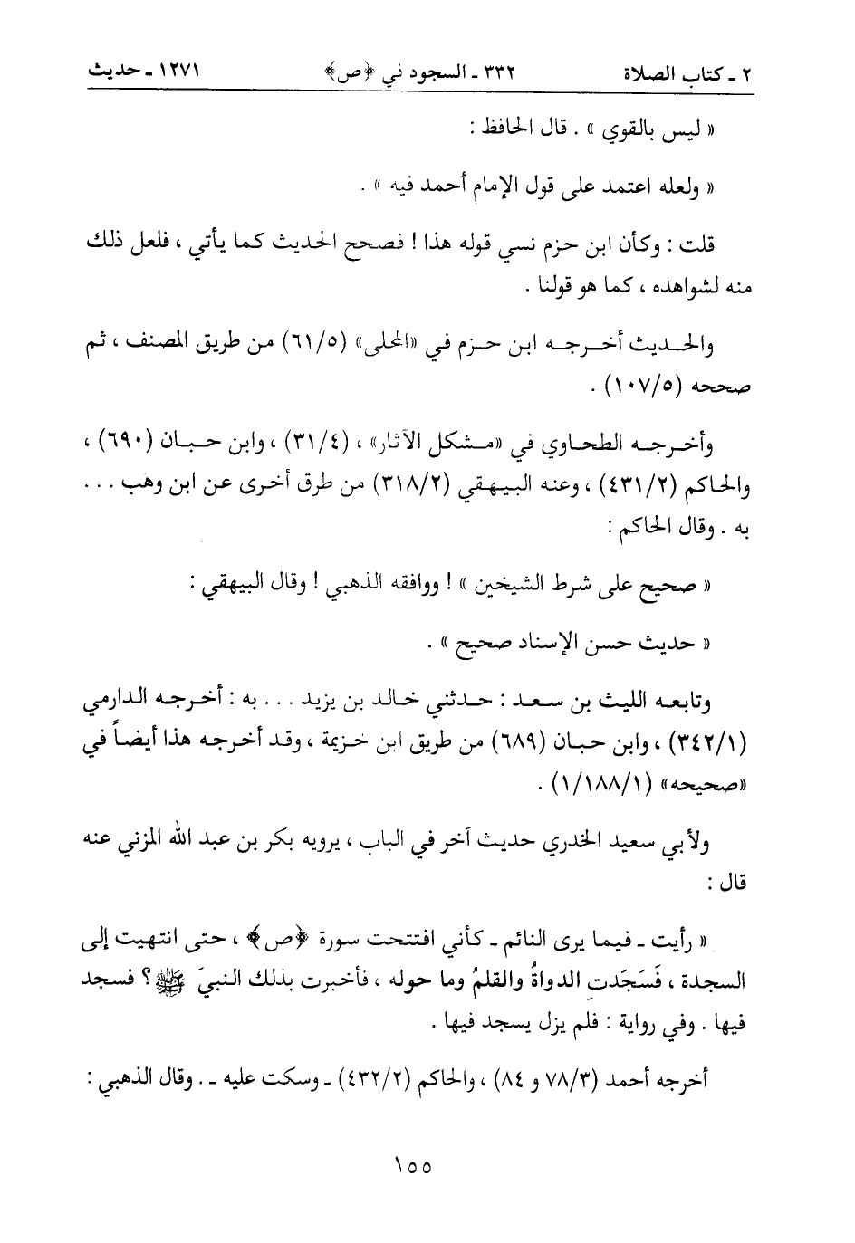 السجدة، فَسَجَدتِ الدواةً والقلمً وما حول، فأخبرت بذلك النبيَ صَلَّى اللَّهُ عَلَيْهِ وَسَلَّمَ؟ فسجد