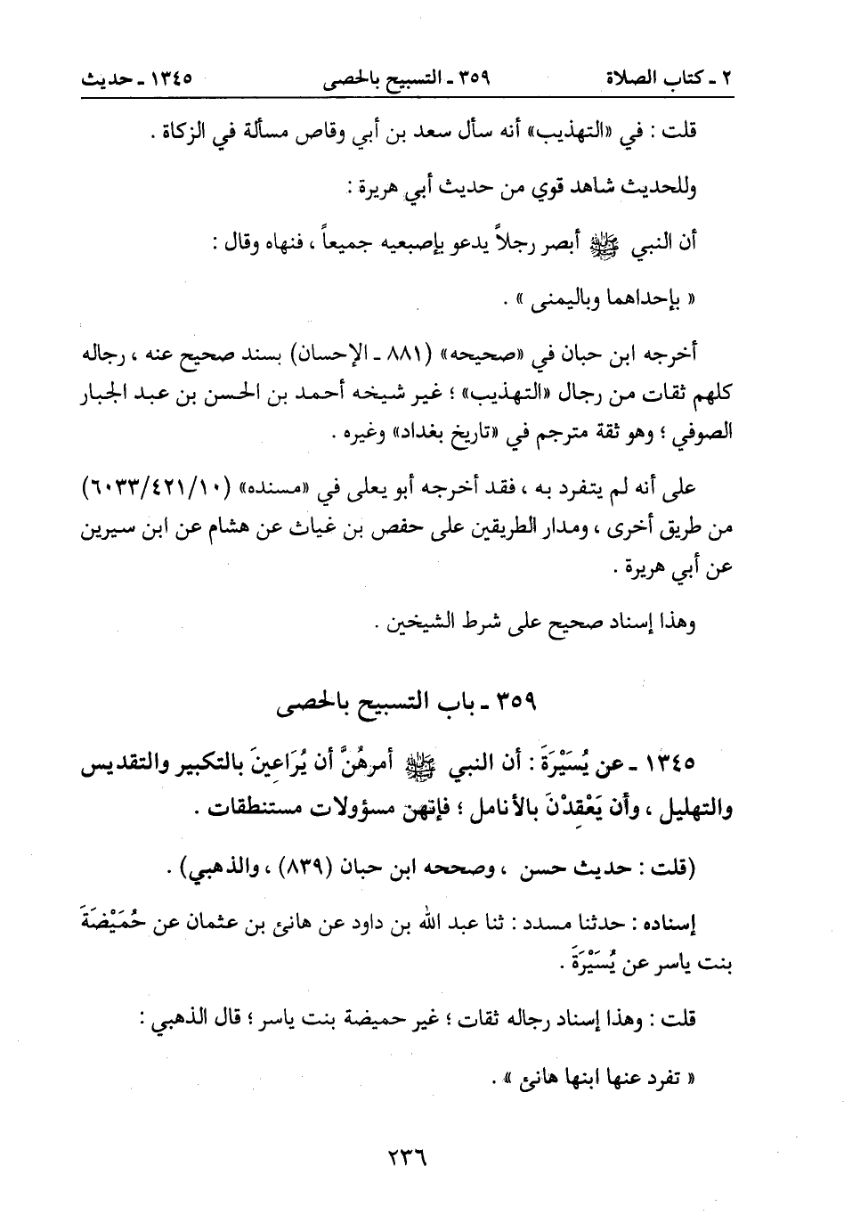 1345- عن يُسَيْرَةَ: أن النبي صَلَّى اللَّهُ عَلَيْهِ وَسَلَّمَ أمرهُنَّ أن يُرَاعِينَ بالتكبير والتقديس