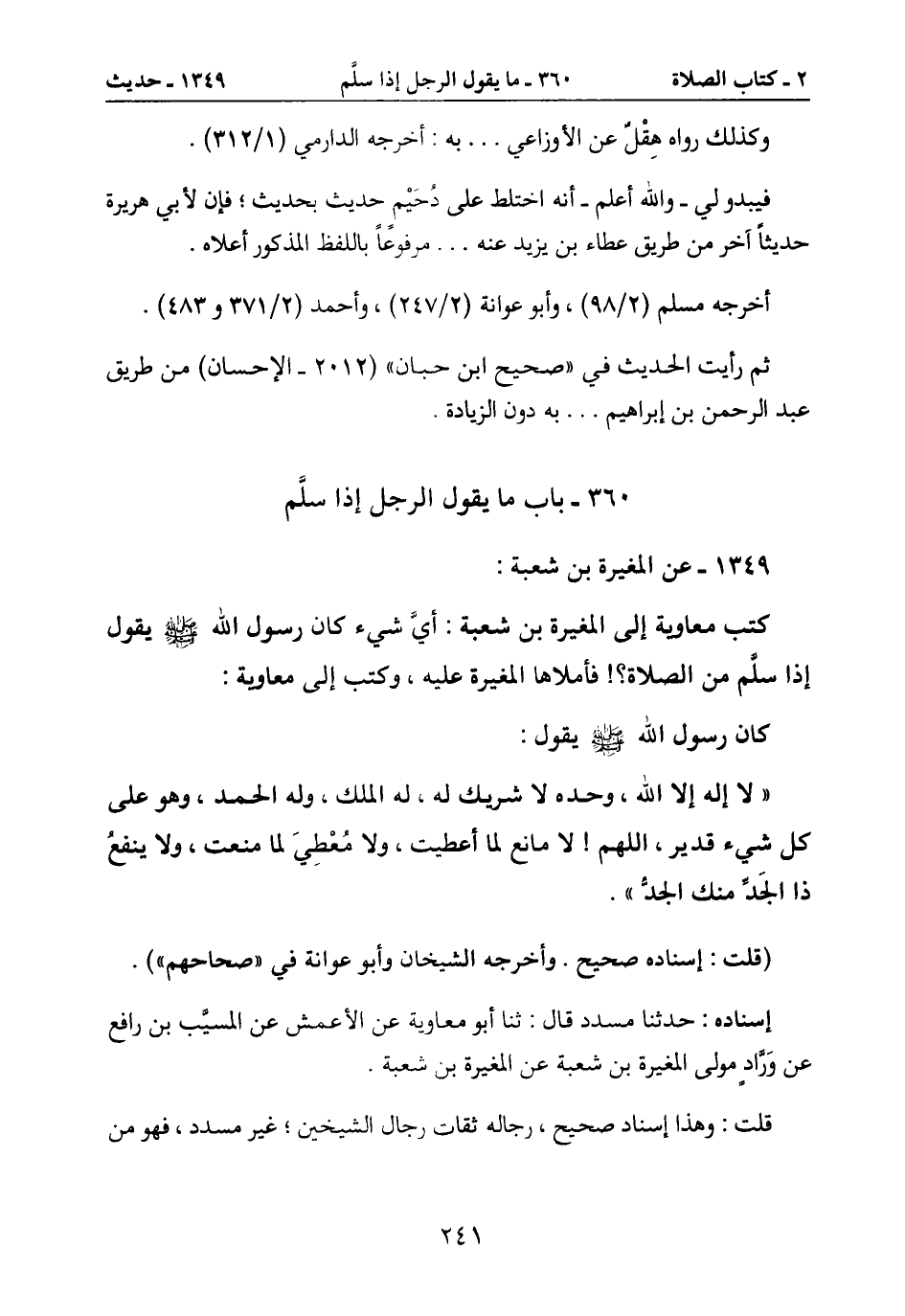 إذا سلم من الصلاة؟! فأملاها المغيرة عليه، وكتب إلى معاوبة: