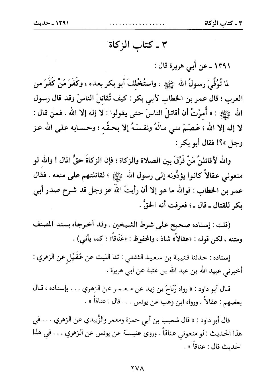 منعوني عقالاً كانوا يؤدّونه إلى رسول الله صَلَّى اللَّهُ عَلَيْهِ وَسَلَّمَ؛ لقاقلتهم على منعه. فقال