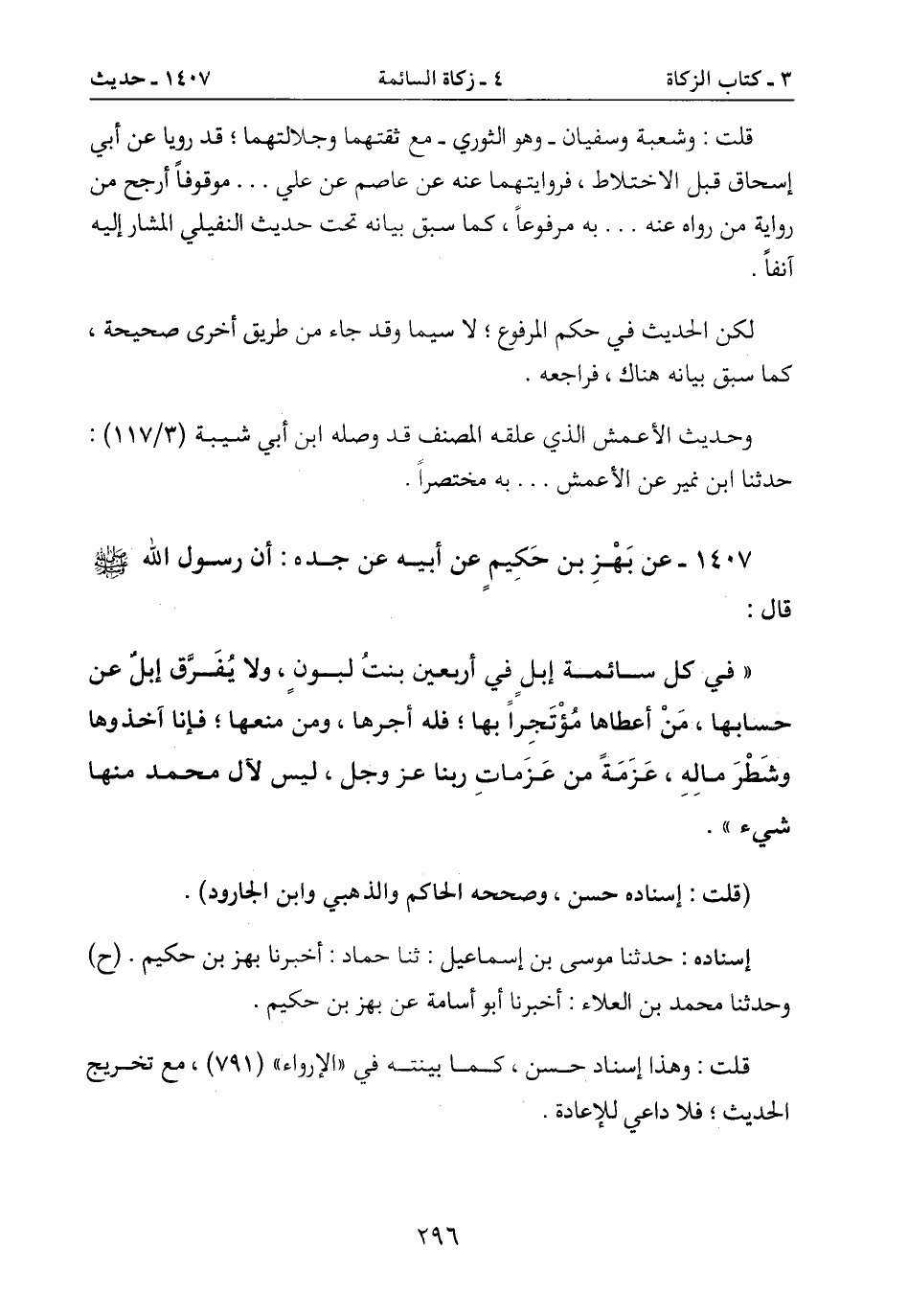 1407- عن بَهْزِ بن حَكِيمٍ عن أبيه عن جده: أن رسول الله صَلَّى اللَّهُ عَلَيْهِ وَسَلَّمَ