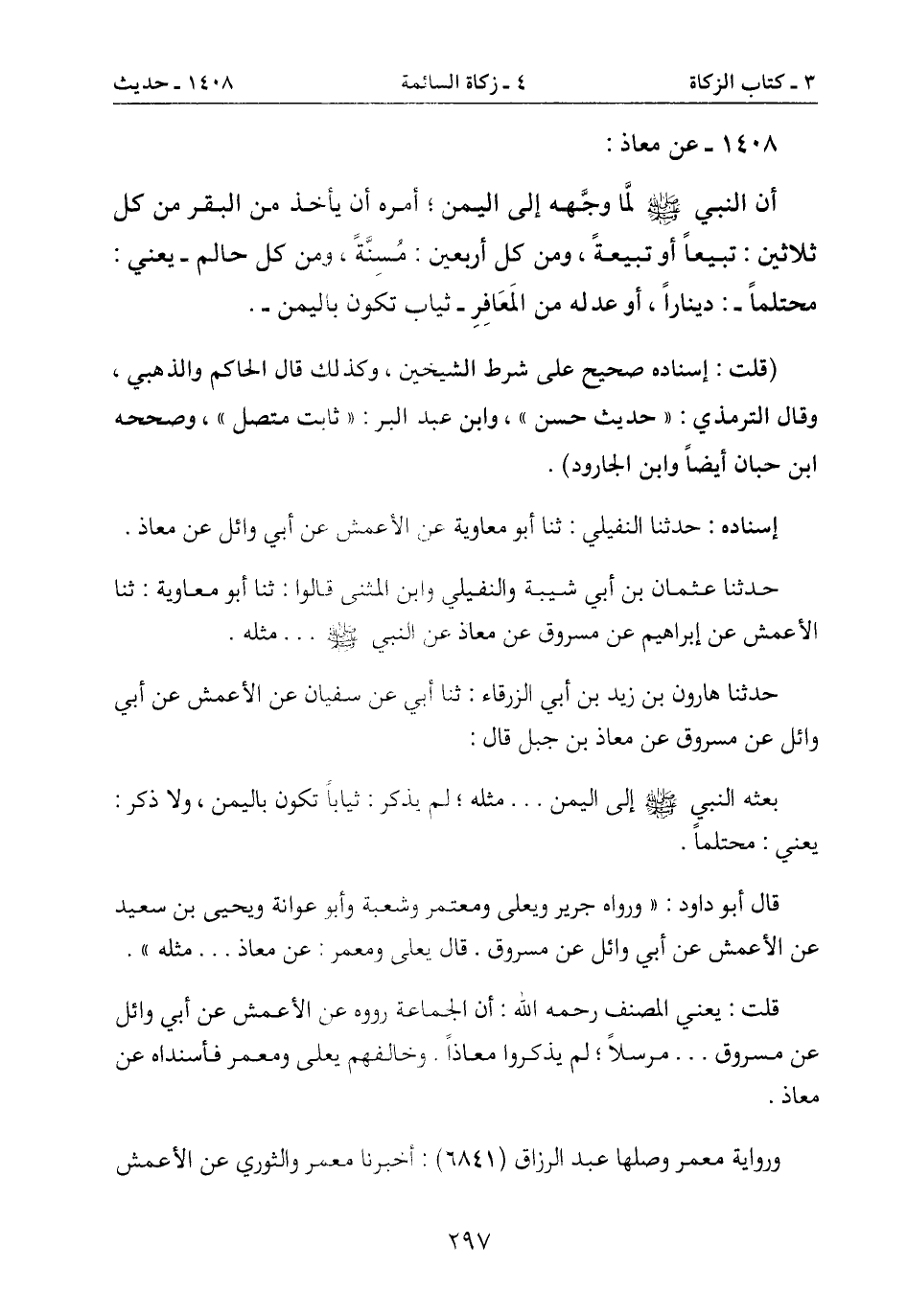 إسناده: حدثنا النفيلي: ثنا أبو معاوية عن الأعمش عن أبي وائل عن معاذ.