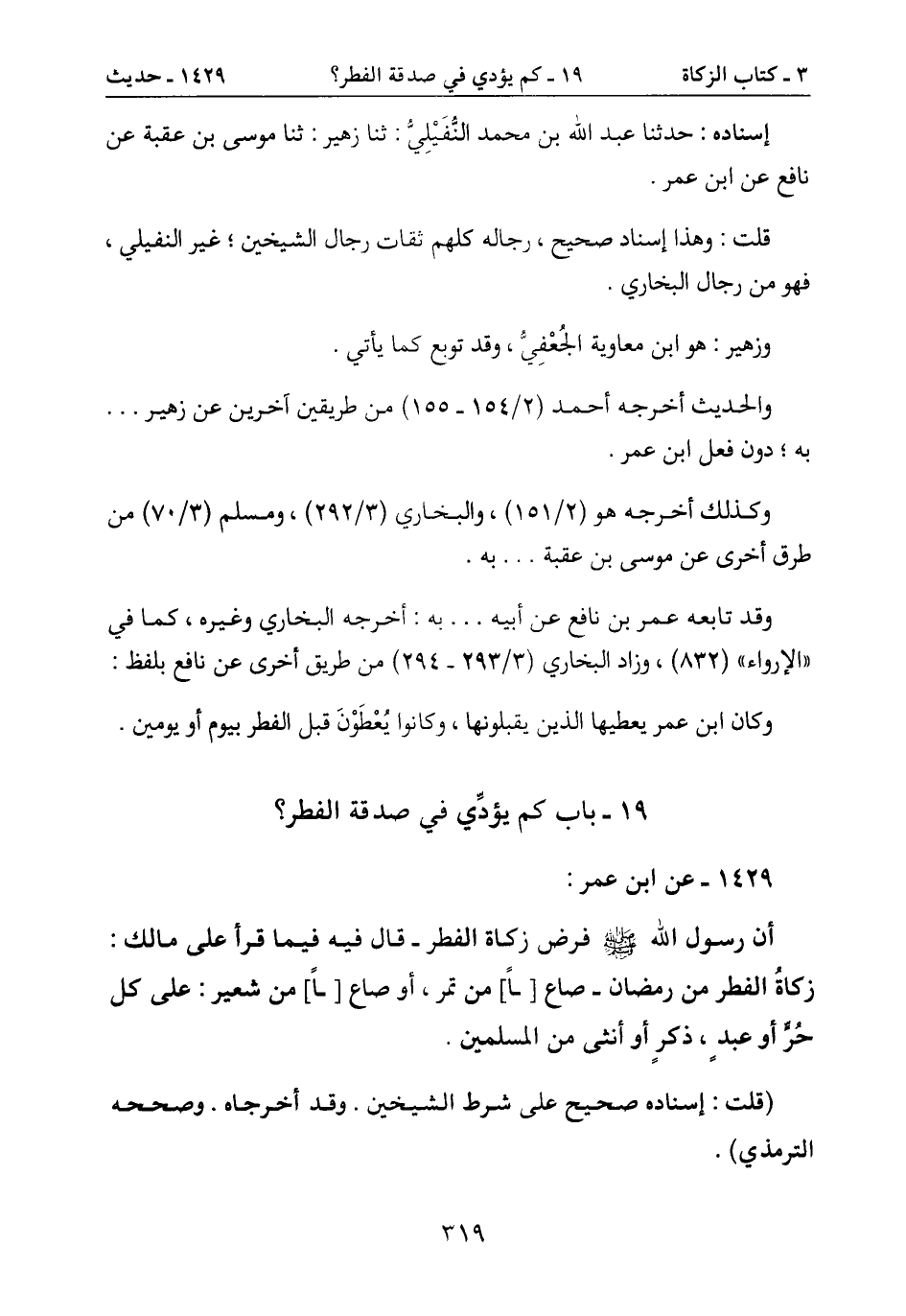 "الإرواء" (832) ، وزاد البخاري (3/293- 294) من طريق أخرى عن نافع بلفظ: