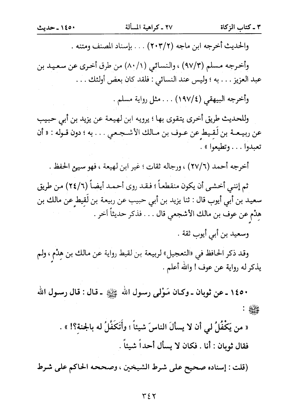 1450- عن ثوبان- وكان مَوْلى رسول الله صَلَّى اللَّهُ عَلَيْهِ وَسَلَّمَ- قال: قال رسول الله صَلَّى اللَّهُ عَلَيْهِ وَسَلَّمَ:
