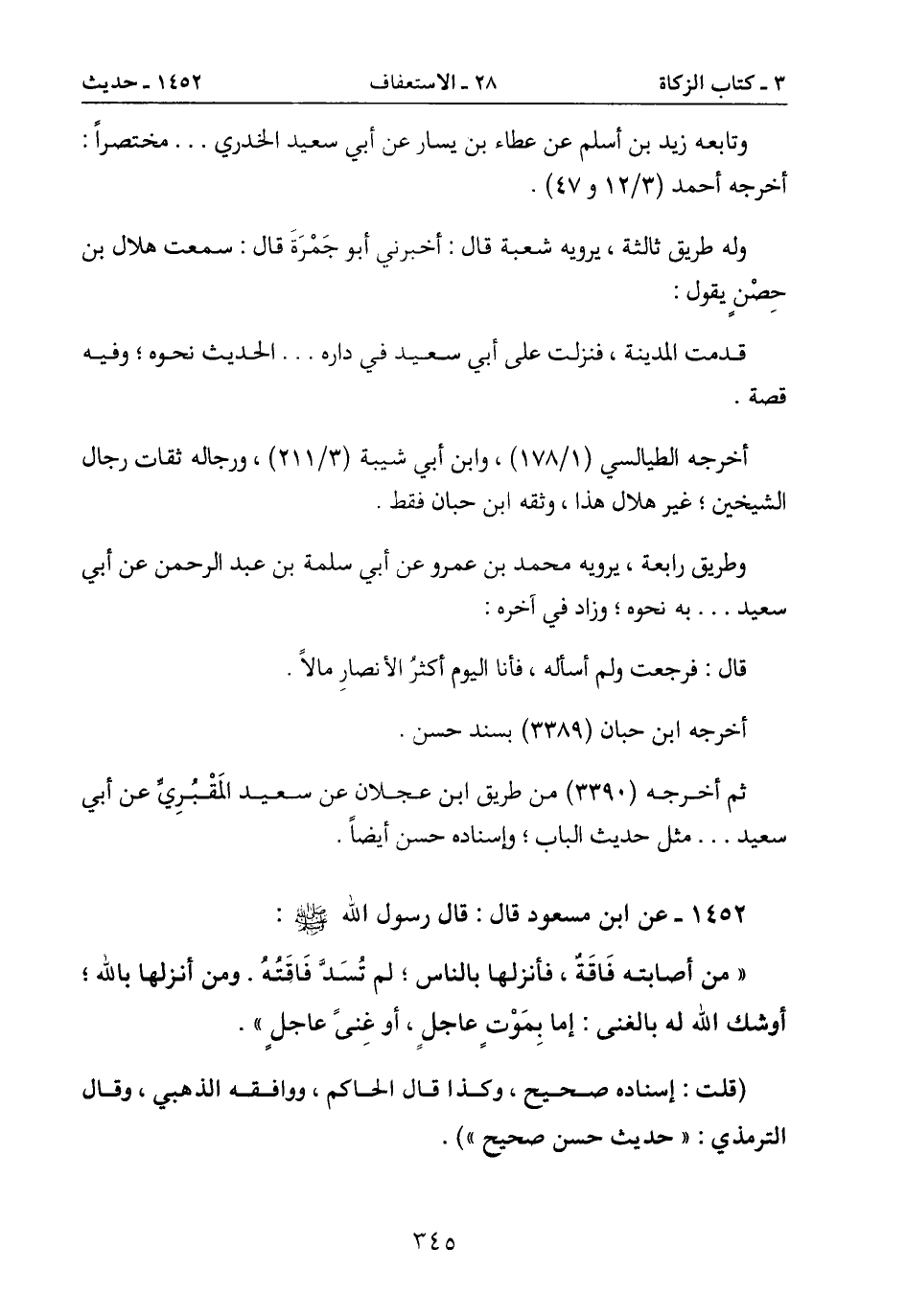 وتابعه زيد بن أسلم عن عطاء بن يسار عن أبي سعيد الخدري ... مختصراً: