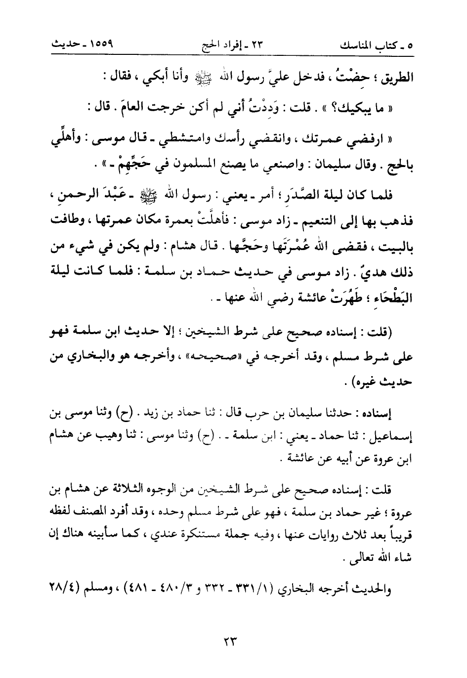 الطريق؛ حِضْت، فدخل علي رسول الله صَلَّى اللَّهُ عَلَيْهِ وَسَلَّمَ وأنا أبكي، فقال: