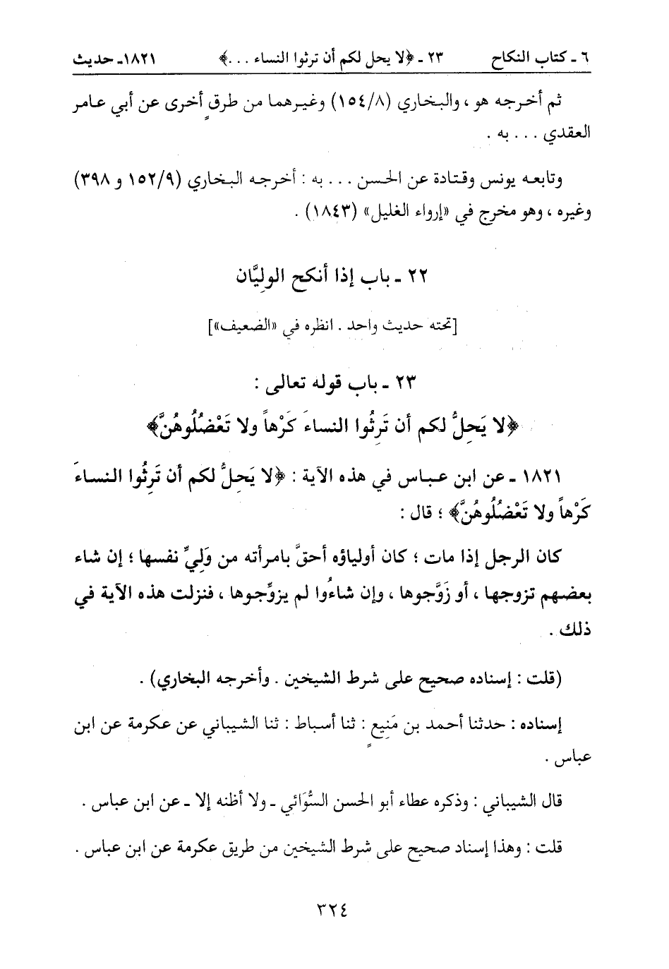 1821- عن ابن عباس في هذه الآية: (لا يَحِلُّ لكم أن تَرِثُوا النساءَ