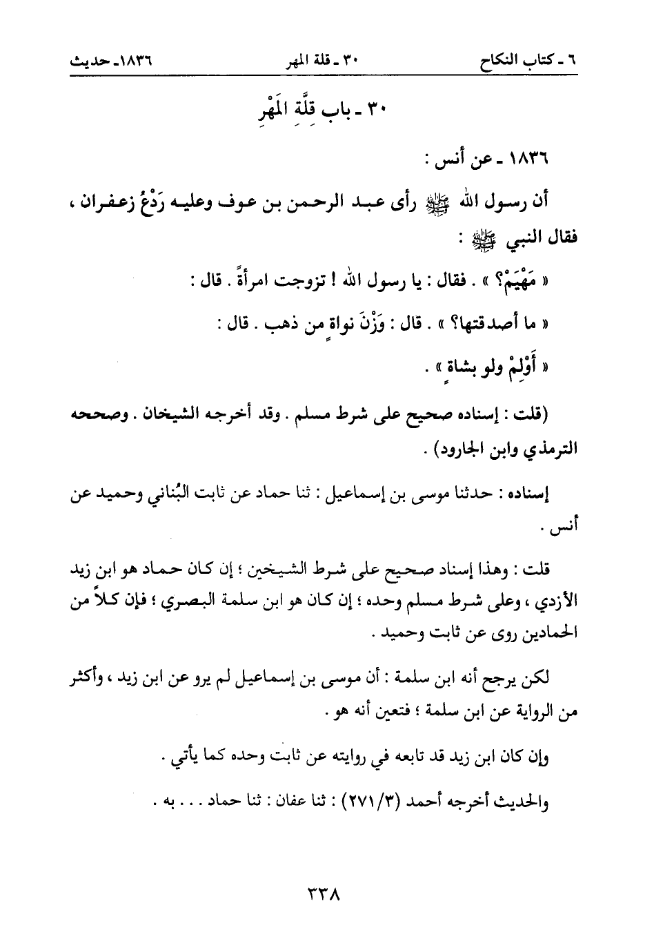 أن رسول الله صَلَّى اللَّهُ عَلَيْهِ وَسَلَّمَ رأى عبد الرحمن بن عوف وعليه رَدْعُ زعفران،