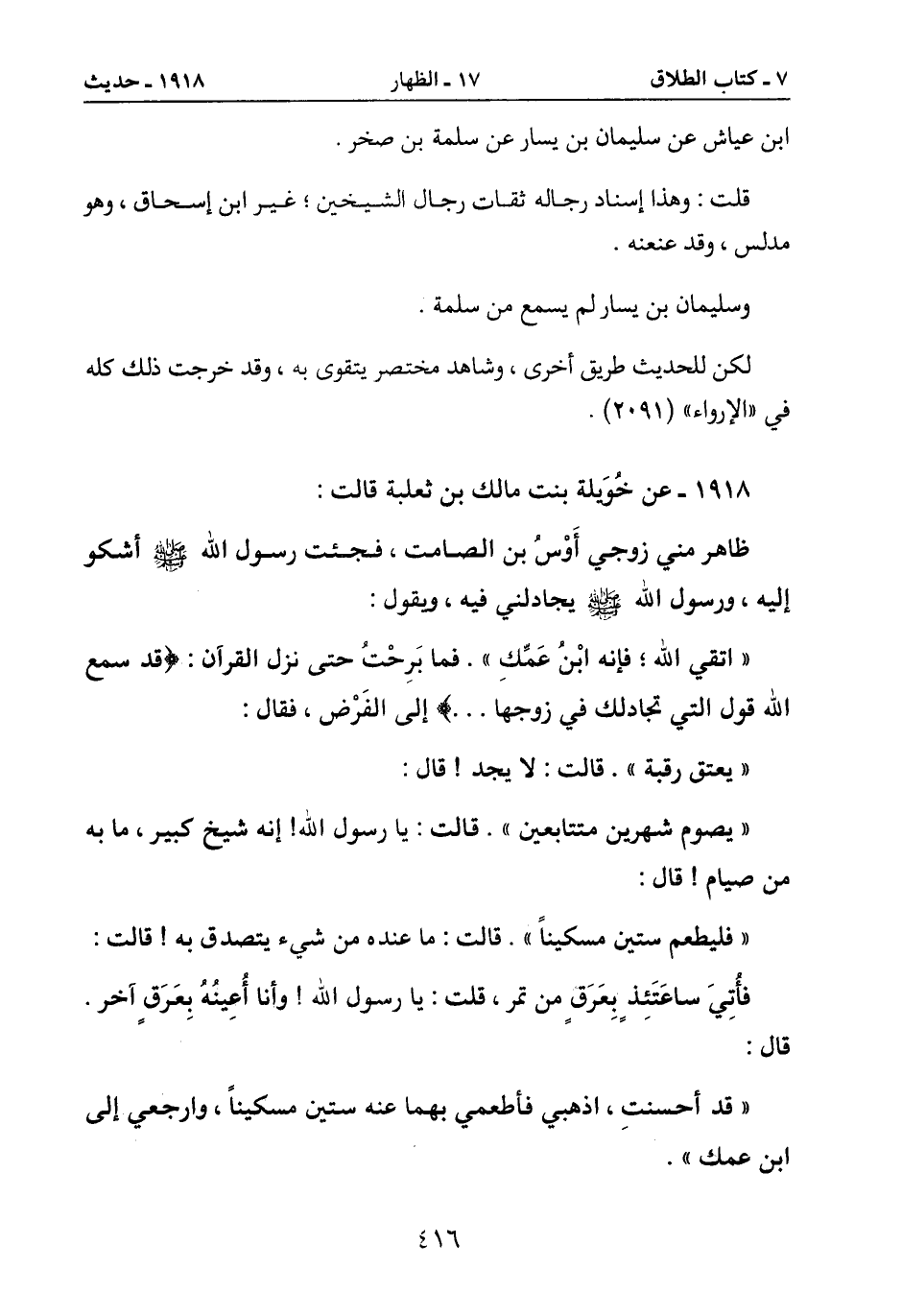 1918- عن خُوَيلة بنت مالك بن ثعلبة قالت: