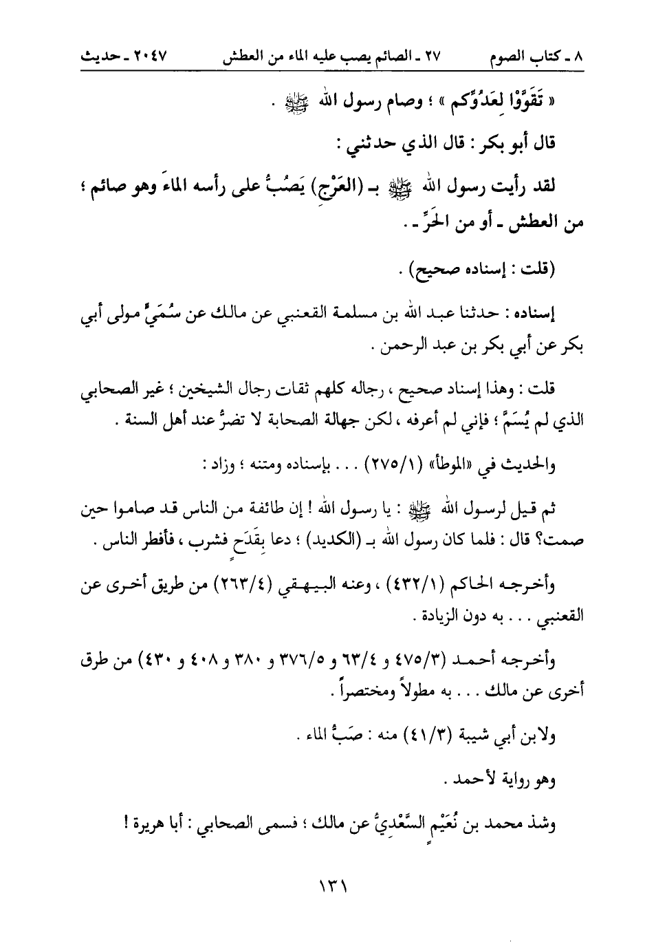 لقد رأيت رسول الله صلع بـ (العَرْجِ) يَصُبُ على رأسه الماءَ وهو صائم؛