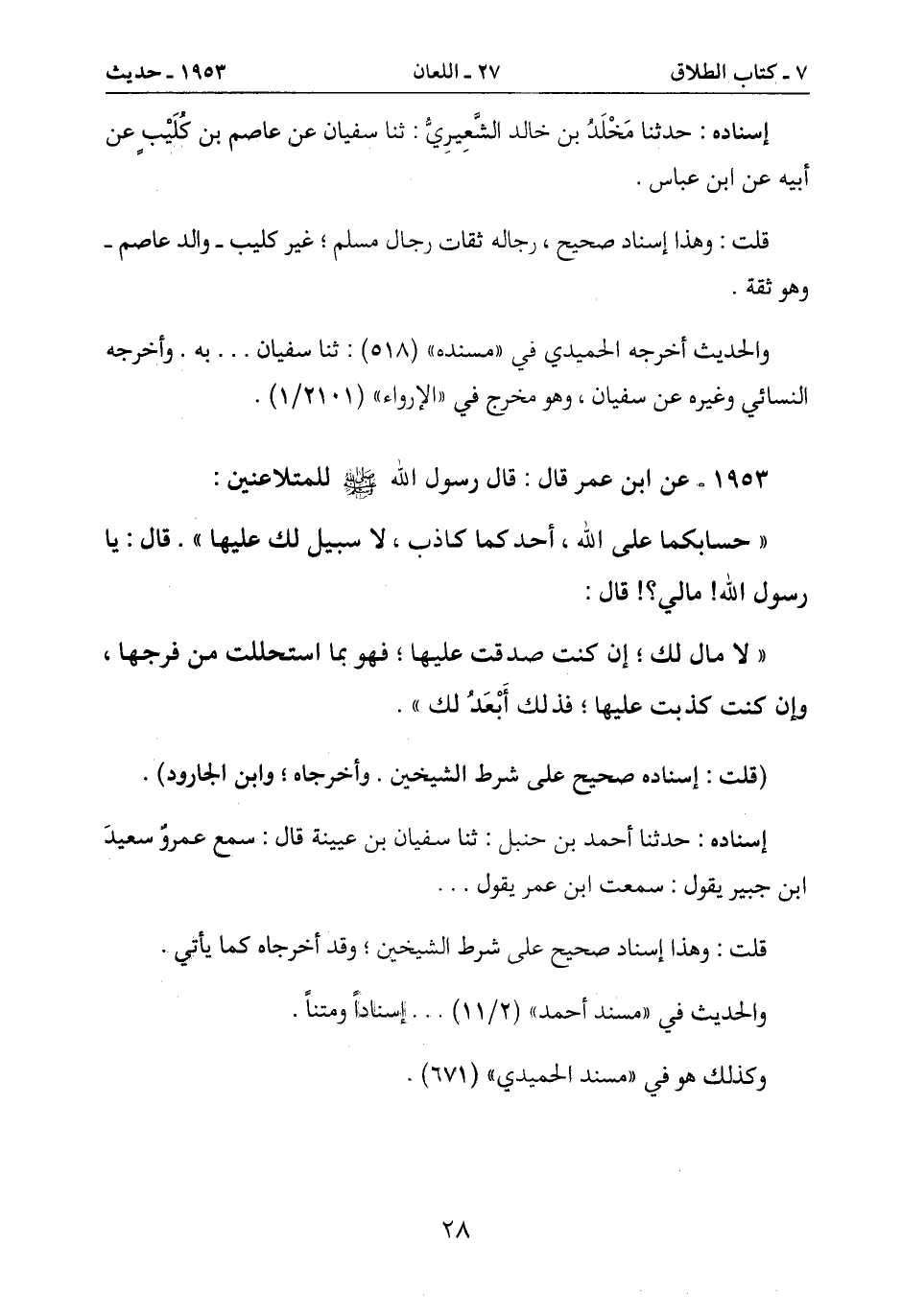 1953- عن ابن عمر قال: قال رسول الله صَلَّى اللَّهُ عَلَيْهِ وَسَلَّمَ للمتلاعنين: