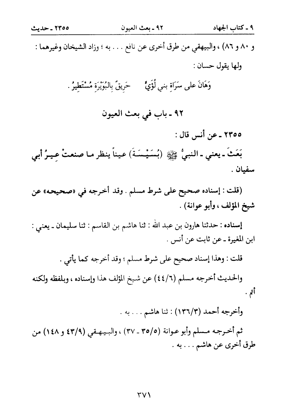 بَعَثَ- يعني- النبيُّ صَلَّى اللَّهُ عَلَيْهِ وَسَلَّمَ (بُسيسة) عيناً ينظر ما صنعتْ عِيرُ أبي