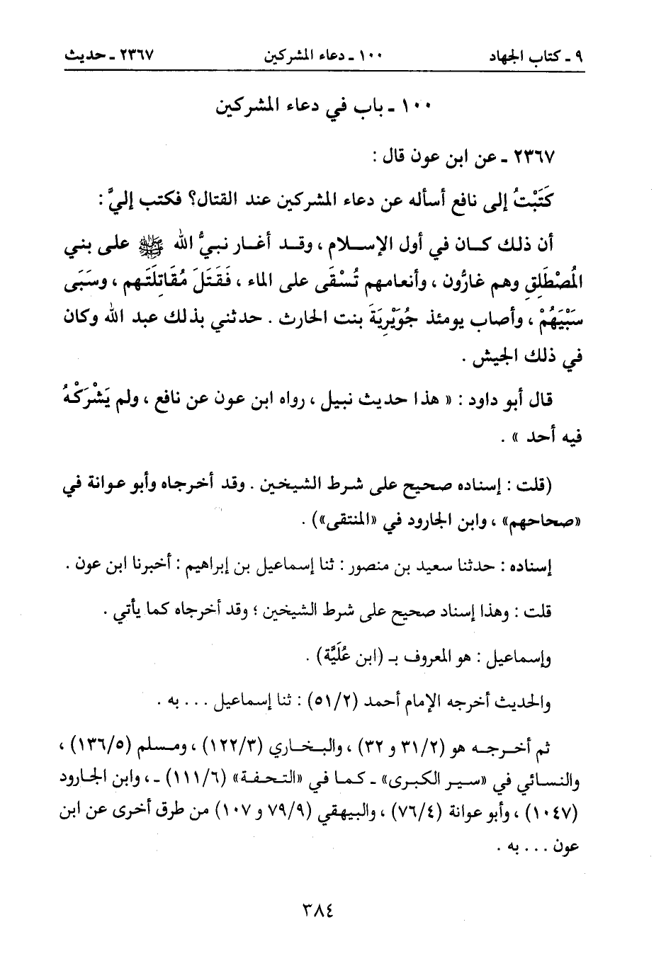 كَتَبْت إلى نافع أسأله عن دعاء المشركين عند القتال؟ فكتب إلي: