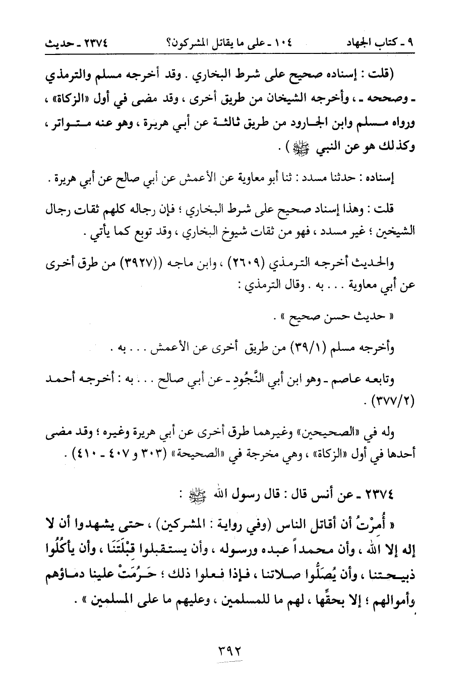 " أُمِرْتُ أن أقاتل الناس (وفي رواية: المشركين) ، حتى يشهدوا أن لا