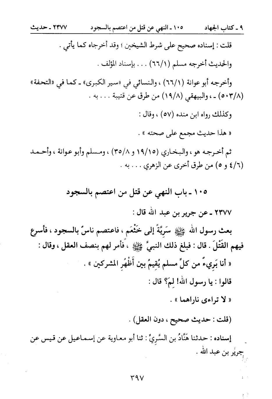 بعث رسول الله صَلَّى اللَّهُ عَلَيْهِ وَسَلَّمَ سَرِّيَةً إلى خَثْعَم، فاعتصم ناسٌ بالسجود، فأسرع