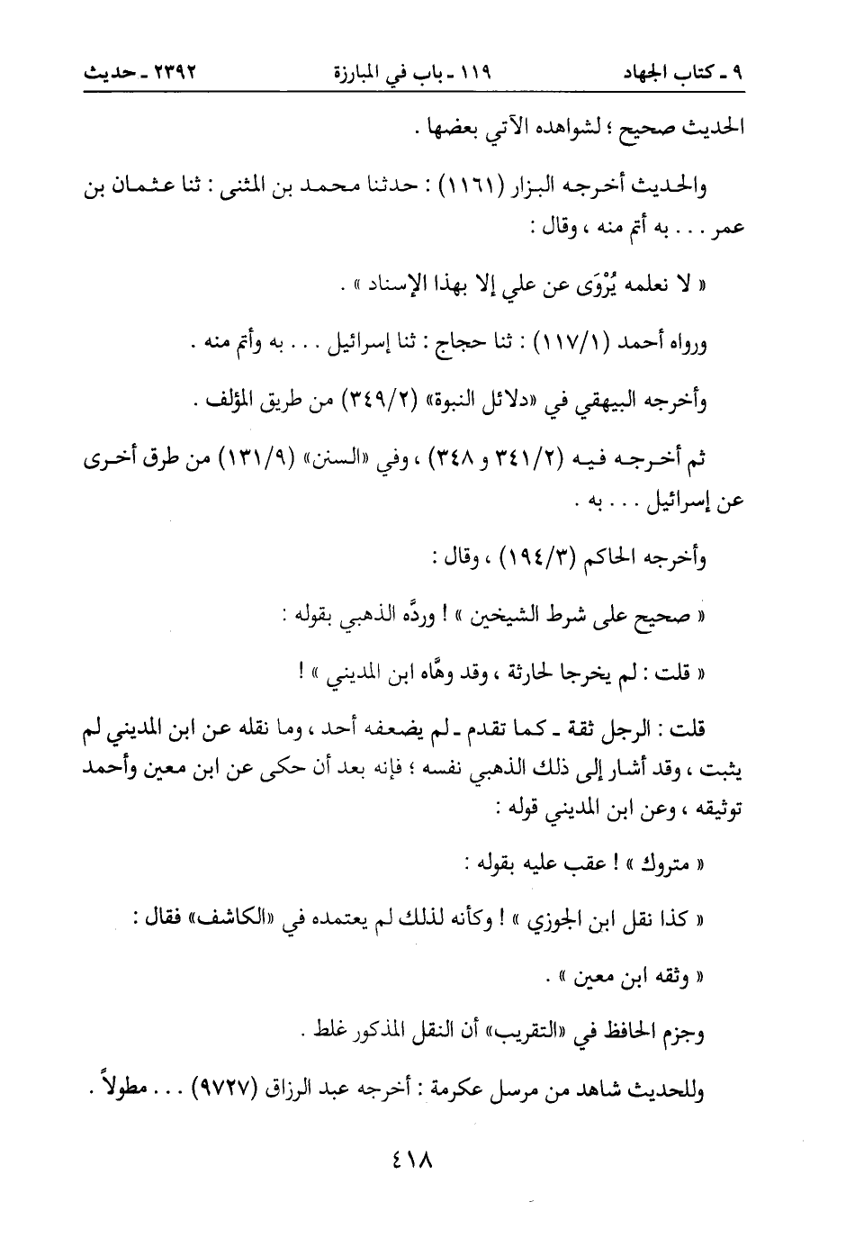 قلت: الرجل ثقة- كما تقدم- لم يضعفه أحد، وما نقله عن ابن المديني لم