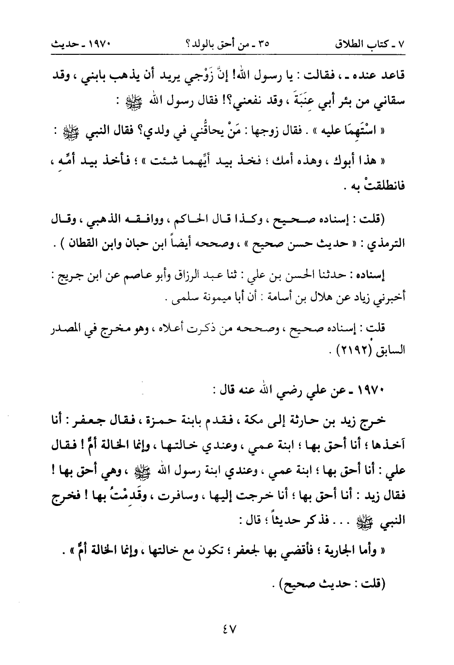 علي: أنا أحق بها؛ ابنة عمي، وعندي ابنة رسول الله صَلَّى اللَّهُ عَلَيْهِ وَسَلَّمَ، وهي أحق بها!
